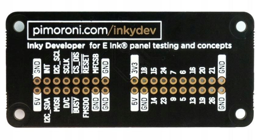 Moduł HAT przeznaczony do podłączenia wyświetlaczy e-Paper i minikomputerów Raspberry Pi. Wyposażony w 14-pinowe złącze JST-SH przeznaczony do wyświetlaczy oraz 40-pinowe złącze GPIO RPi. Moduł współpracuje w ramach systemu Inky Developer, który daje możliwość łączenia i dopasowywania płyt głównych mikrokontrolerów lub SBC i różnych wyświetlaczy ePaper.