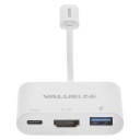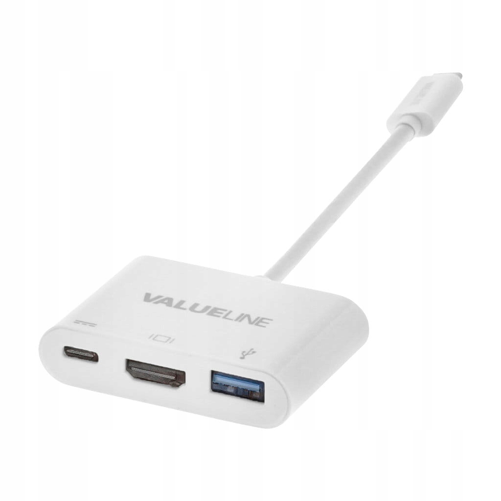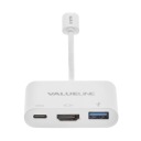 Wielofunkcyjne akcesorium do laptopa! Przejściówka 3-w-1 marki Valueline radzi sobie z większością zadań niezależnie od tego, czy musisz wyświetlić film o wysokiej rozdzielczości na telewizorze, czy podłączyć do laptopa aparaty, pamięci USB, czy inne urządzenia z USB typu A. Z jednej strony przejściówki jest umieszczony wtyk męski USB C, który podłącza się do komputera, a wyjścia to HDMI (typu A), USB C i USB A.