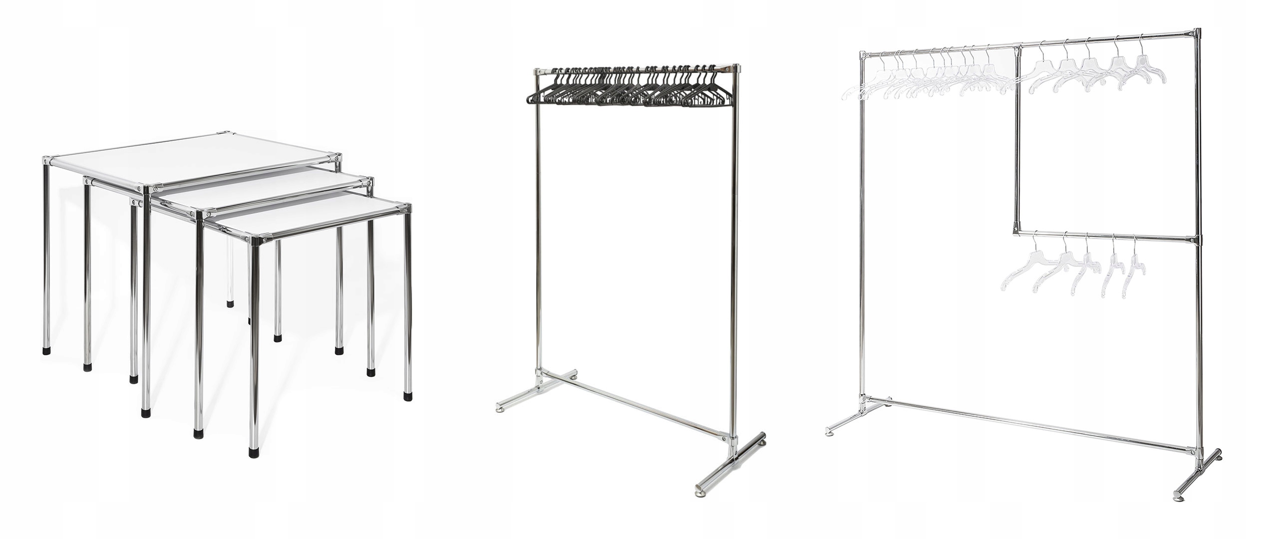 • System pozwala nam tworzyć różnorodne konstrukcje, takie jak wieszaki przyścienne i wolnostojące, gondole, ekspozytory, stojaki, regały z półkami, przymierzalnie, stoliki oraz wiele innych.