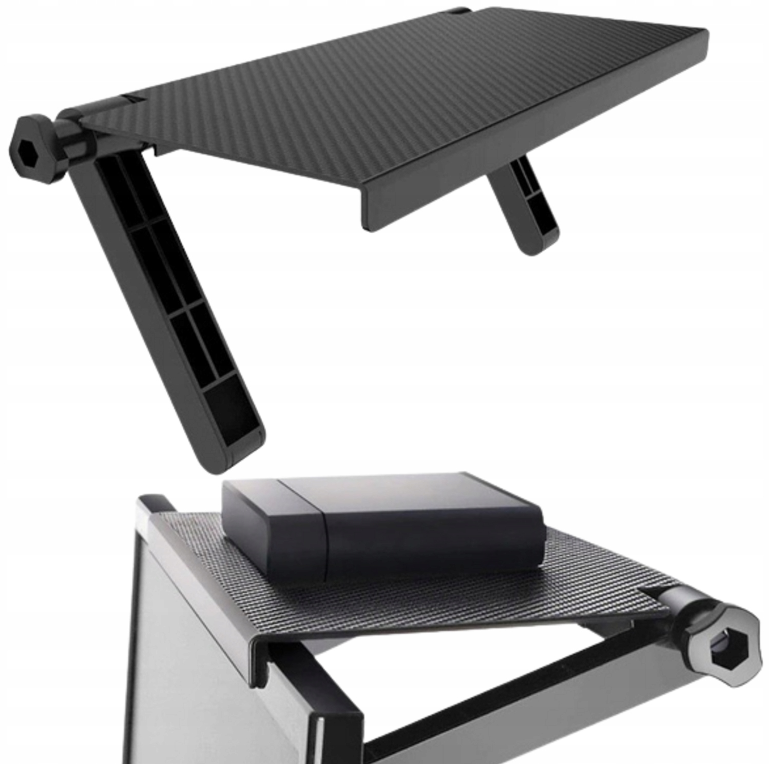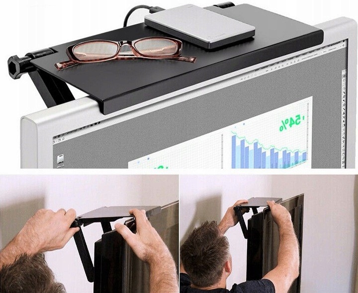 Montaż półki nie wymaga użycia żadnych narzędzi. Regulowane nóżki pozwalają na bezinwazyjny montaż bez użycia jakichkolwiek narzędzi. Wystarczy przyłożyć półkę do monitora, dokręcić pokrętła nóżek i gotowe.