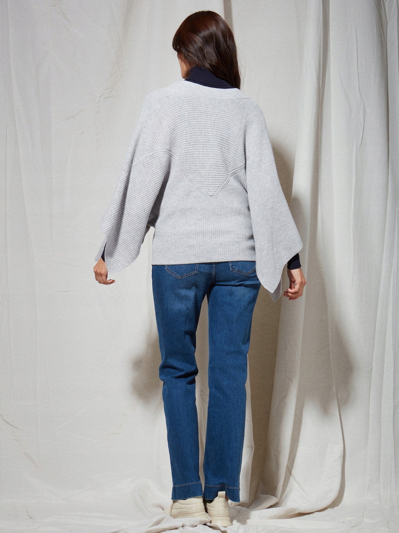 Niezwykle wygodne poncho zachwyca miękką mieszanką wełny merynosów i kaszmiru i jednokolorowym designem .Duży, prążkowany dekolt w szpic nadaje klasycznemu fasonowi sportowego niuansu .Swobodny krój oraz rozcięte ,szerokie rękawy powodują dużą wygodę noszenia. Idealnie skomponuje się zarówno z ołówkową spódnicą jak i ze spodniami.