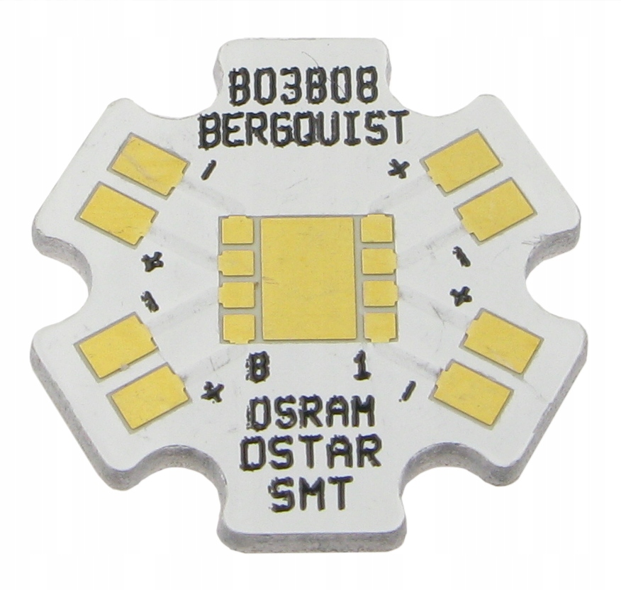 Radiator do diod LED OSRAM Ostar (MCPCB, star, gwiazdka). Gwiazda 19,9mm, grubość 1,57mm. Materiał: aluminium. Biała soldermaska, folia miedziana 35um. Radiator należy przymocować do większego, właściwego radiatora, profilu aluminiowego czy innego elementu rozpraszającego ciepło, najlepiej z zastosowaniem pasty, kleju lub podkładki termoprzewodzącej.