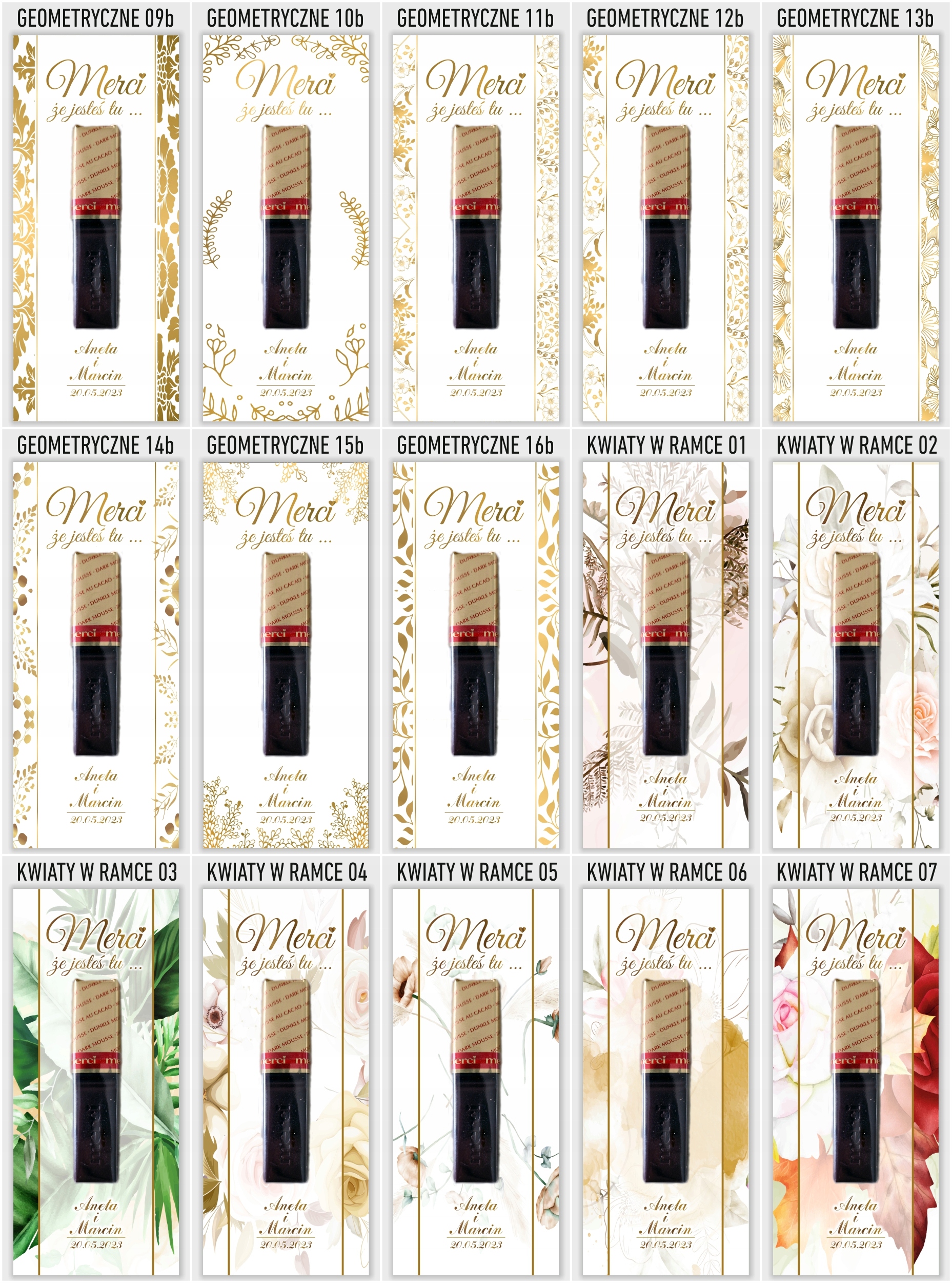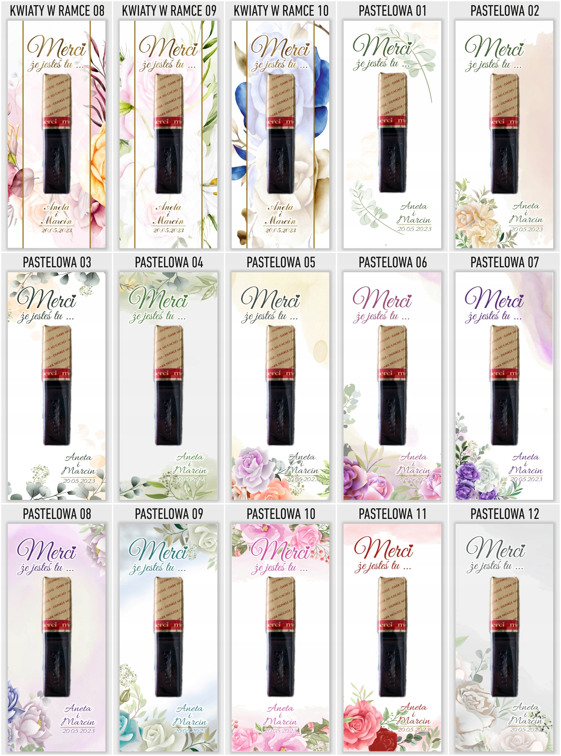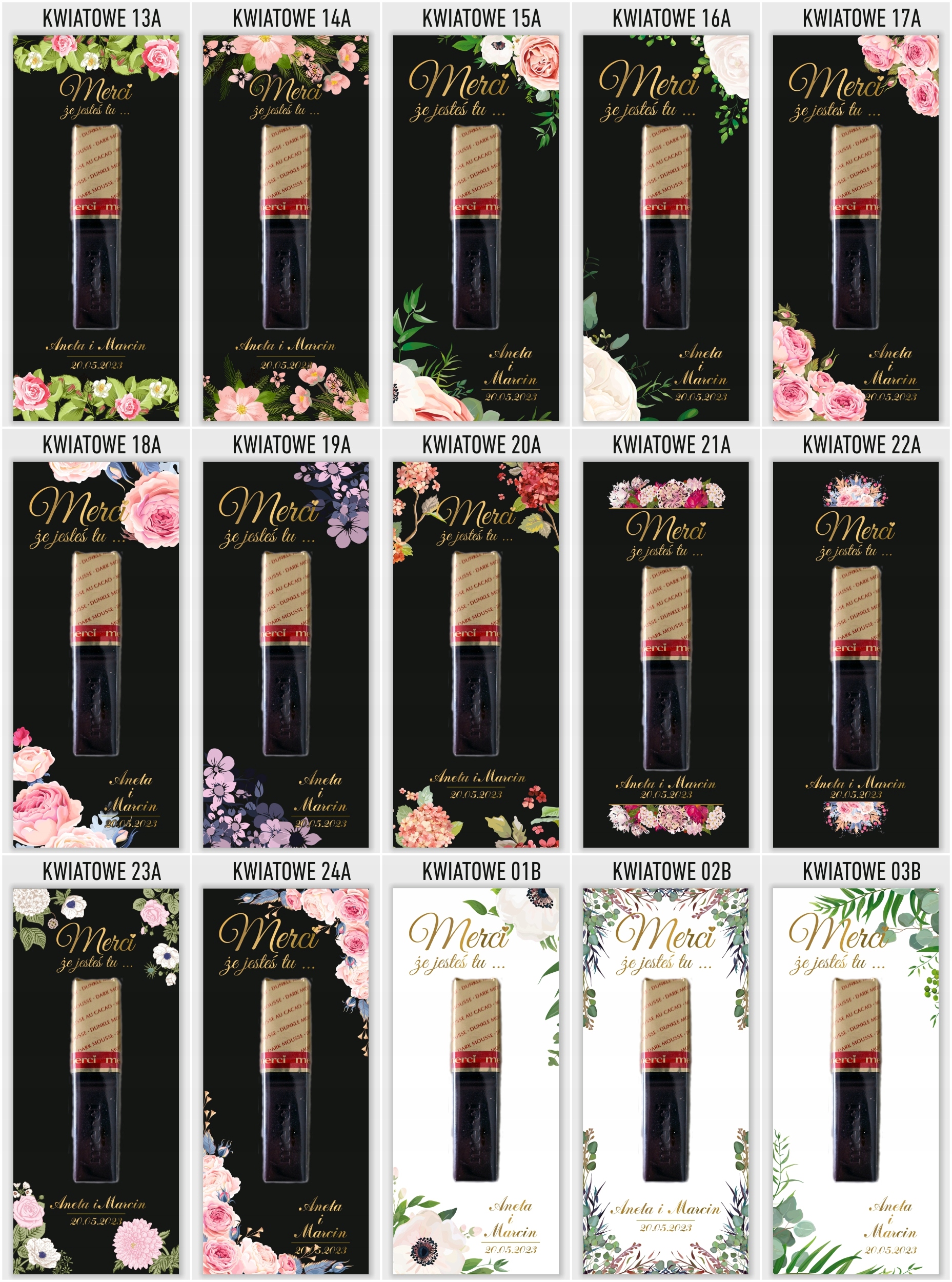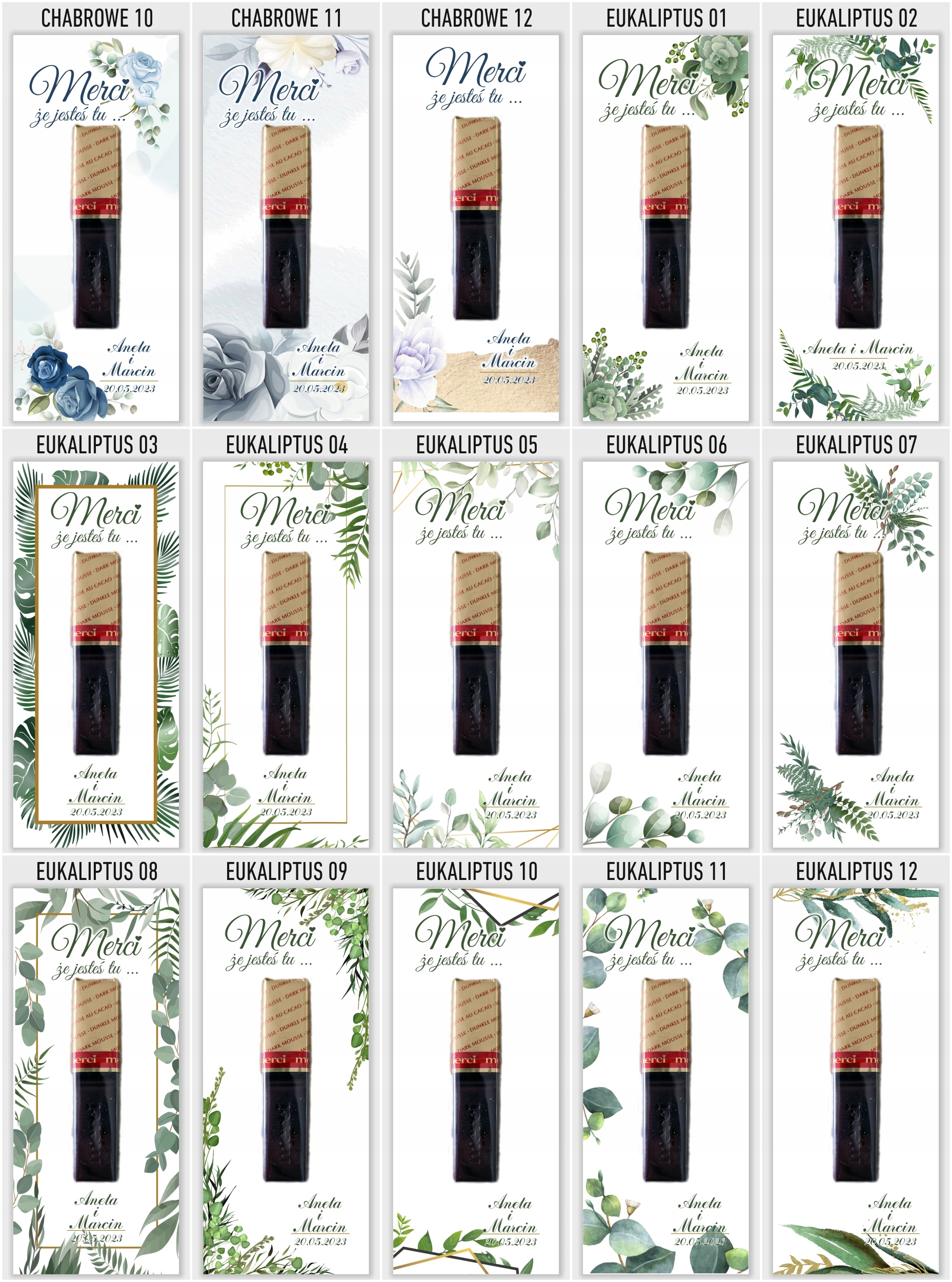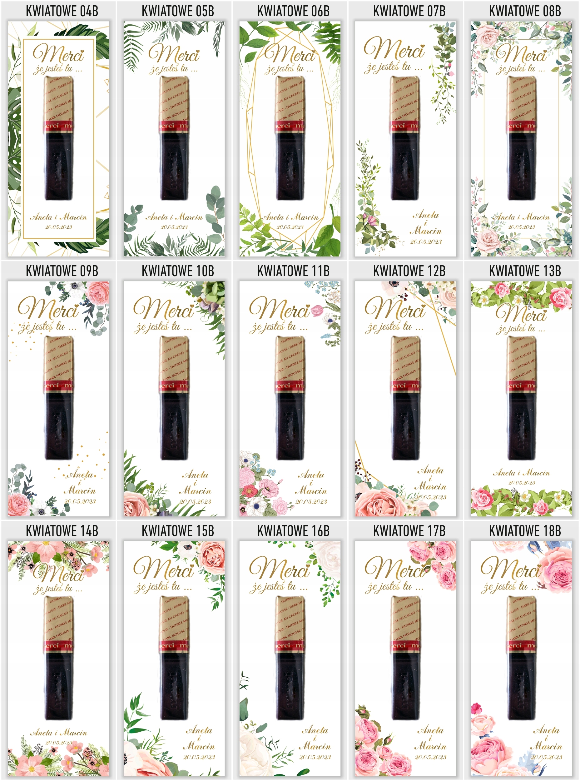 Elegancka i gustowna pamiątka dla gości weselnych. Podziękowania drukujemy na grubym i sztywnym papierze kredowym o gramaturze 350g. Umieszczamy na podziękowaniach imiona młodych oraz datę ślubu. W komplecie znajduje się 6 sztuk podziękowań i 12 sztuk pianek samoprzylepnych do przyklejenia czekoladki. Kupując 1 szt. na allegro otrzymasz 6 karteczek i 12 pianek . Czekoladki na podziękowaniach służą jedynie jako wizualizacja rozmiaru oraz rozmieszczenia na bileciku. Czekoladki należy przykleić we własnym zakresie.
