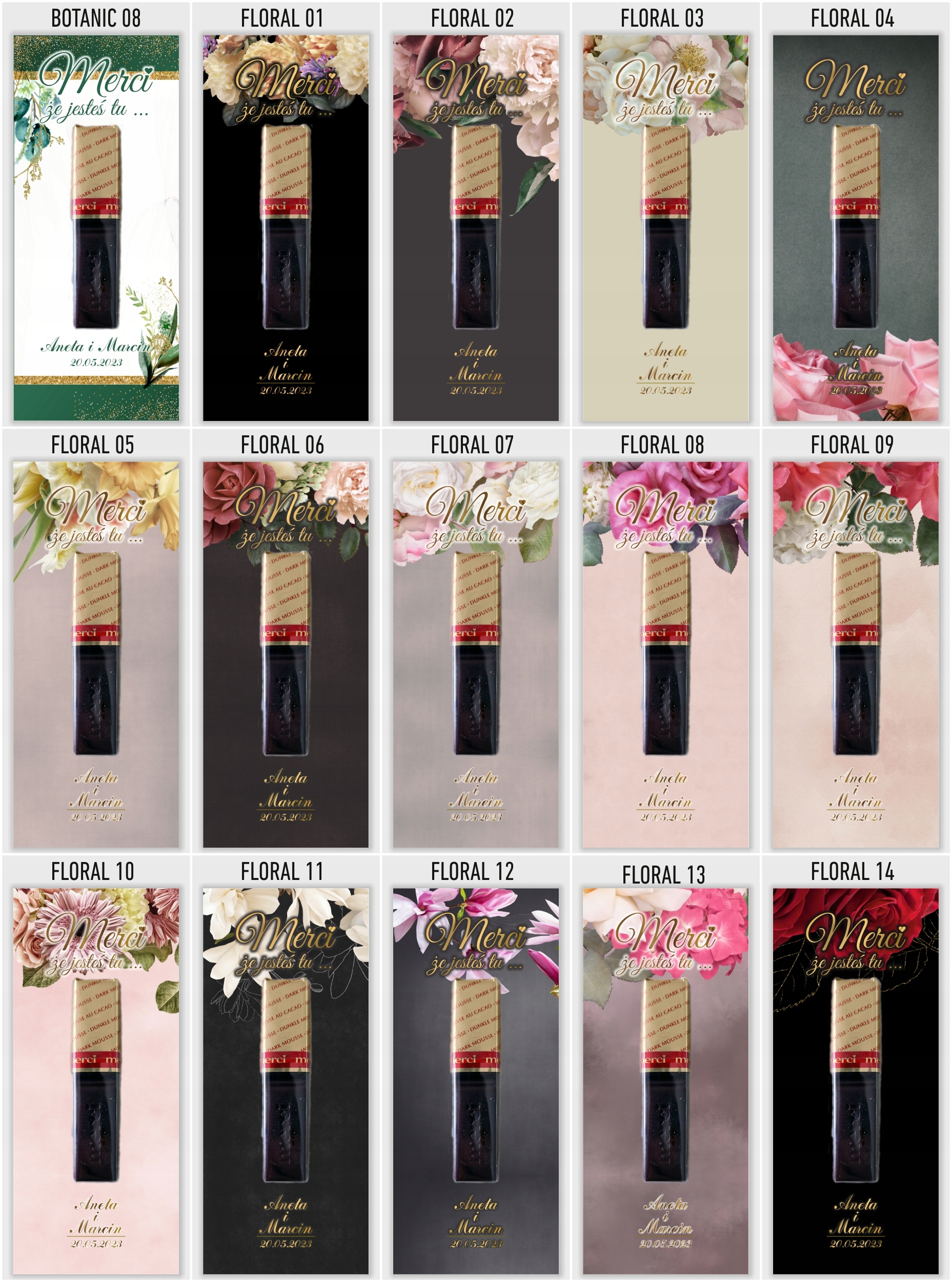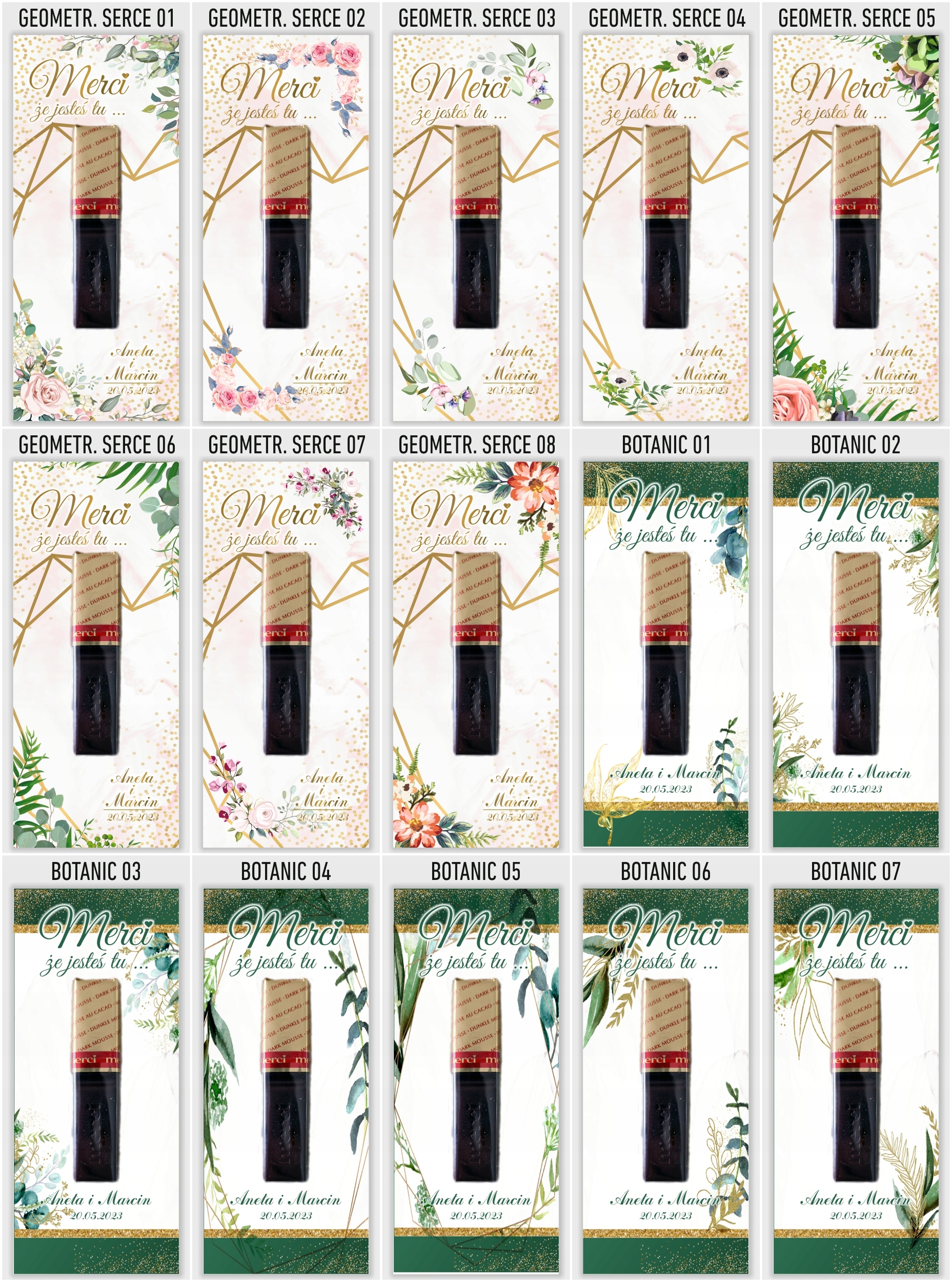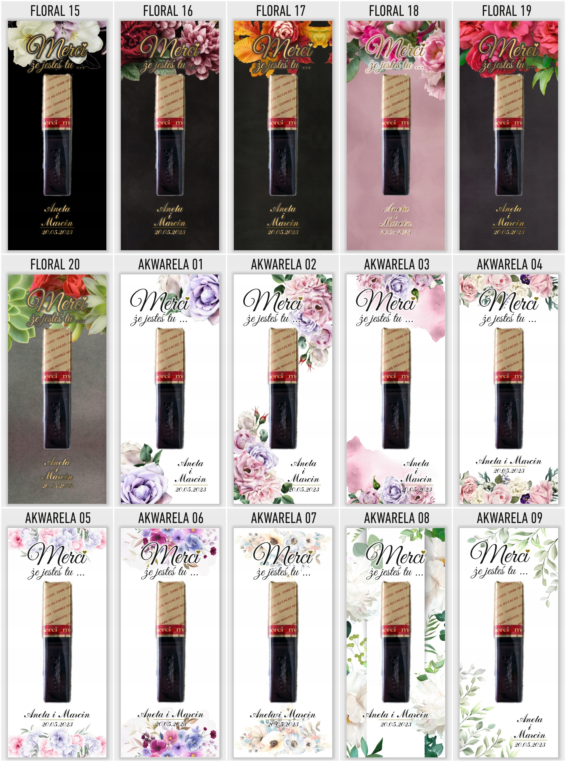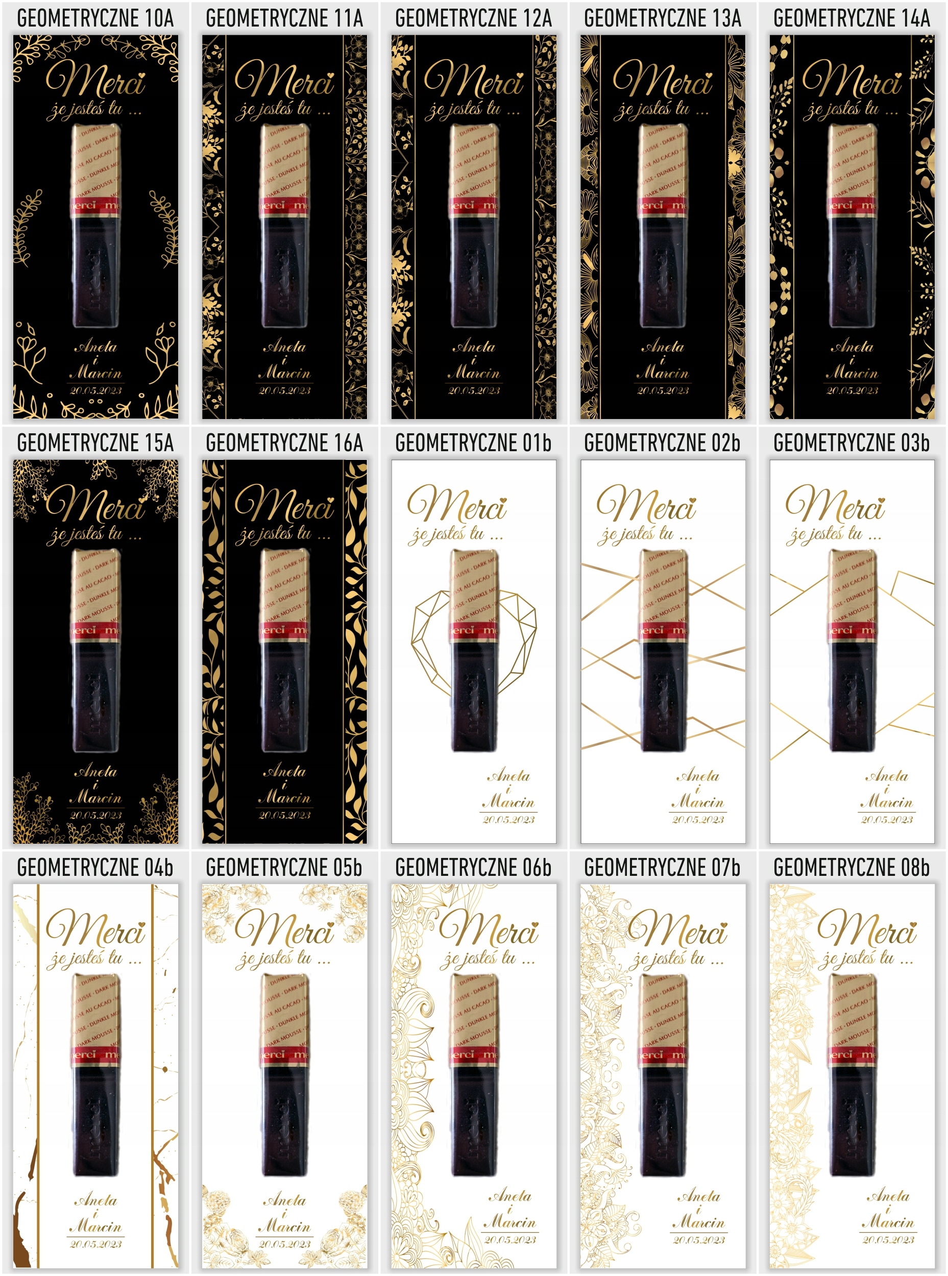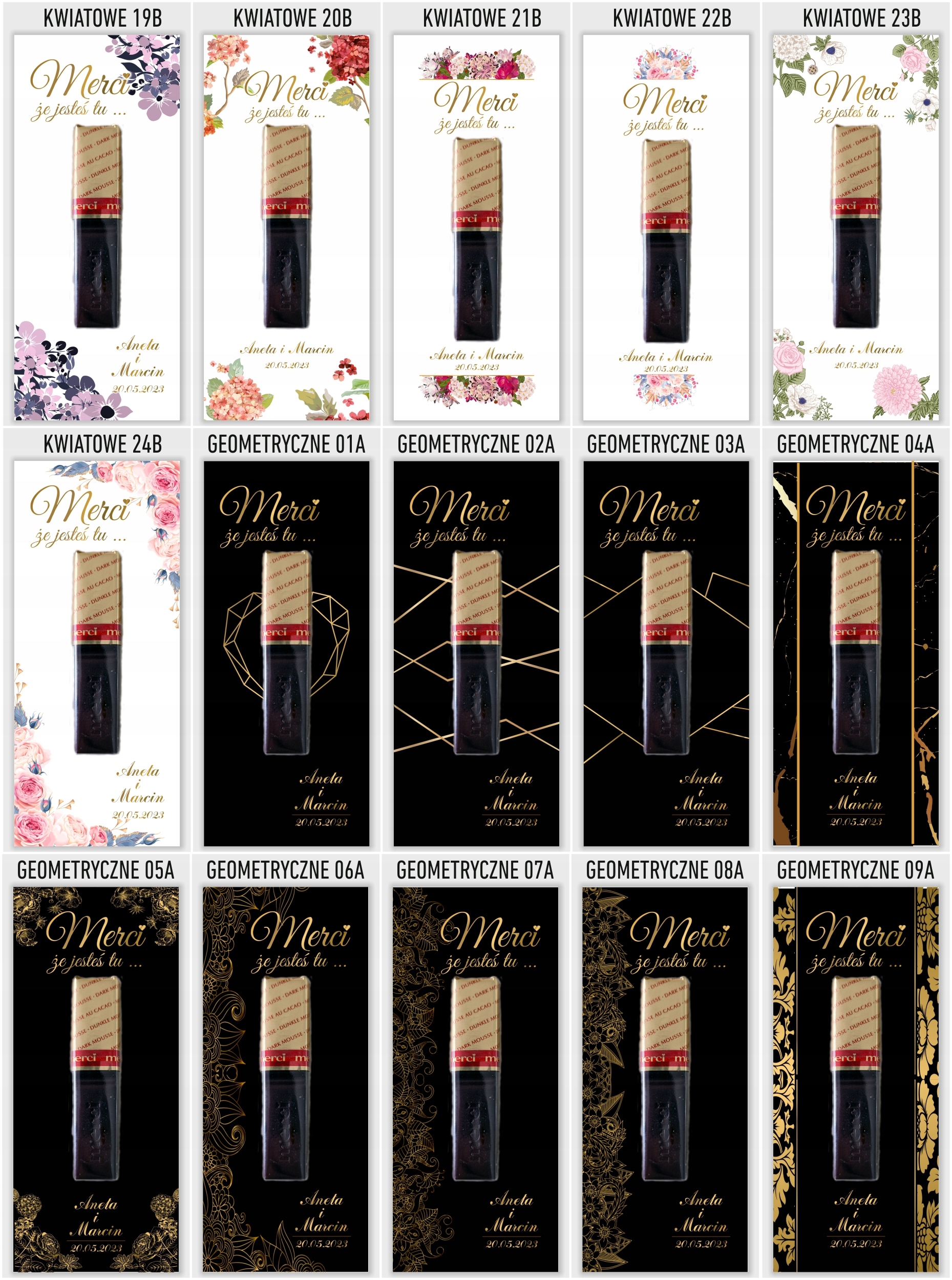 Elegancka i gustowna pamiątka dla gości weselnych. Podziękowania drukujemy na grubym i sztywnym papierze kredowym o gramaturze 350g. Umieszczamy na podziękowaniach imiona młodych oraz datę ślubu. W komplecie znajduje się 6 sztuk podziękowań i 12 sztuk pianek samoprzylepnych do przyklejenia czekoladki. Kupując 1 szt. na allegro otrzymasz 6 karteczek i 12 pianek . Czekoladki na podziękowaniach służą jedynie jako wizualizacja rozmiaru oraz rozmieszczenia na bileciku. Czekoladki należy przykleić we własnym zakresie.