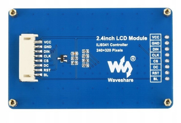 Moduł z kolorowym wyświetlaczem LCD TFT 2,4" o rozdzielczości 240×320 px. Wyświetlacz posiada wbudowany kontroler ILI9341, komunikacja odbywa się za pomocą interfejsu SPI. Do moduł dostępne jest wsparcie dla użytkowników w postaci przykładów użycia z Raspberry Pi, Arduino i STM32.