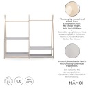 Wieszak na ubrania Mamoi wykonano w sposób bezpieczny dla dzieci oraz środowiska naturalnego przy wykorzystaniu wysokiej jakości, certyfikowanych preparatów. Produkt utrzyma obciążenie do 10 kg. Precyzyjne dopasowanie każdego z elementów, gładkie krawędzie i delikatny materiał zapobiegają skaleczeniu się i zapewniają bezpieczeństwo. W zestawie znajdują się boki konstrukcji, drążki, beżowy materiał oraz metalowe elementy montażowe. Jasnoszary odcień gwarantuje stylowy i ponadczasowy wygląd. Prosty kształt gwarantuje ponadczasowość i uniwersalność.