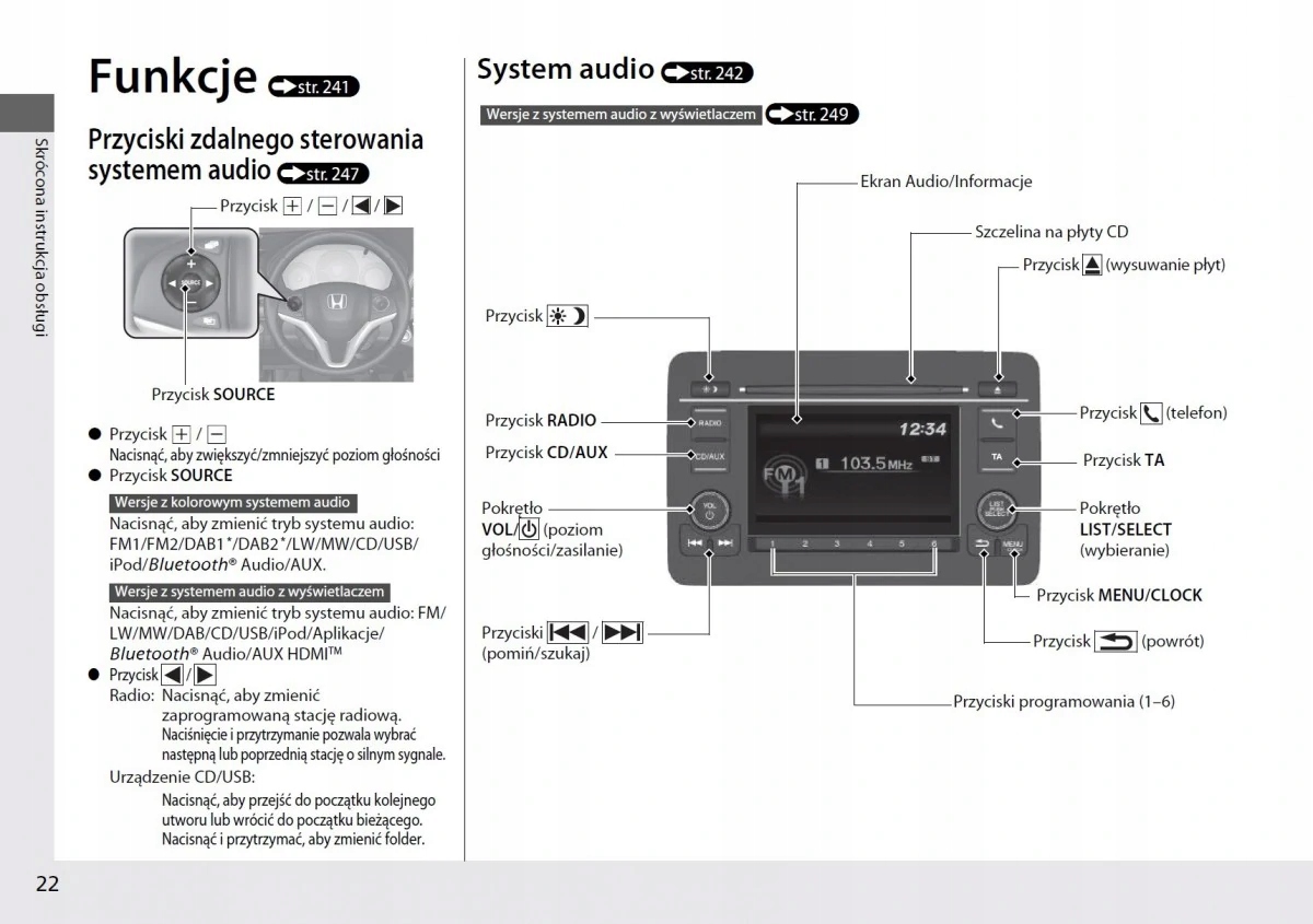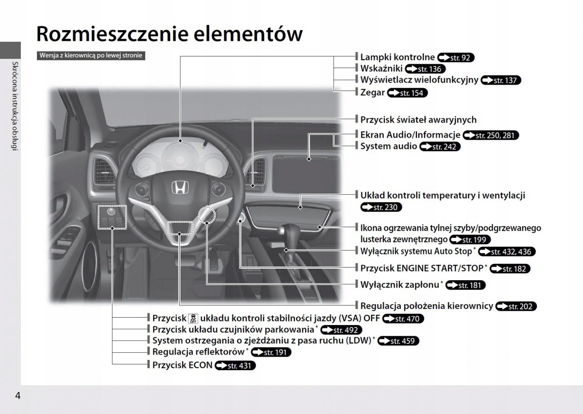 Instrukcja obsługi Hondy zawiera wszystkie wersje wyposażenia oraz przydatne informacje jak sprawnie i bezpiecznie użytkować pojazd np.-wskaźniki, lampki kontrolne, otwieranie i zamykanie-oświetlenie i widoczność, fotele, schowki, ogrzewanie, wentylacja, klimatyzacja-jazda, wskazówki eksploatacyjne, konserwacja pojazdu-poziomy płynów, sprawdzanie i uzupełnianie, czynności awaryjne, wymiana kół, bezpieczniki, wymiana żarówek-dane techniczne... oraz wiele wiele innych rzeczy, które dają poczucie bezpieczeństwa oraz komfortu podróżującym. Polskie prawo nakłada na sprzedawcę obowiązek dołączania instrukcji obsługi auta w języku polskim do . Instrukcja obsługi auta jest nowa i w języku polskim.