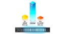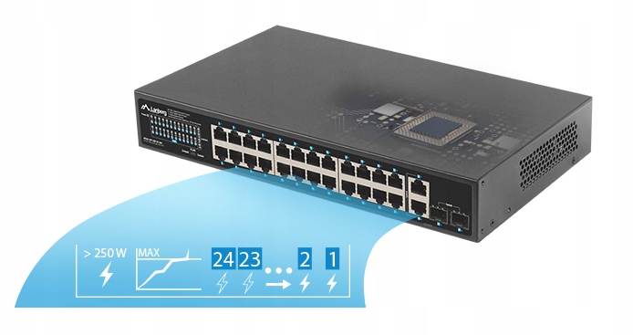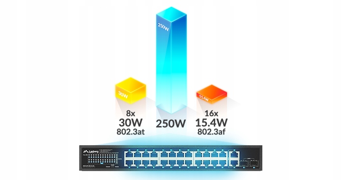 Switch został wyposażony łącznie w 28 portów, w tym 24 porty PoE+ (Gigabit Ethernet), 2 Uplink (Gigabit Ethernet) oraz 2 Uplink (SFP Gigabit). Przemyślana konstrukcja i dbałość o jakość komponentów zapewnia użytkownikowi aż do 250 W całkowitej realnej mocy dla urządzeń końcowych, co oznacza możliwość podłączenia równocześnie: