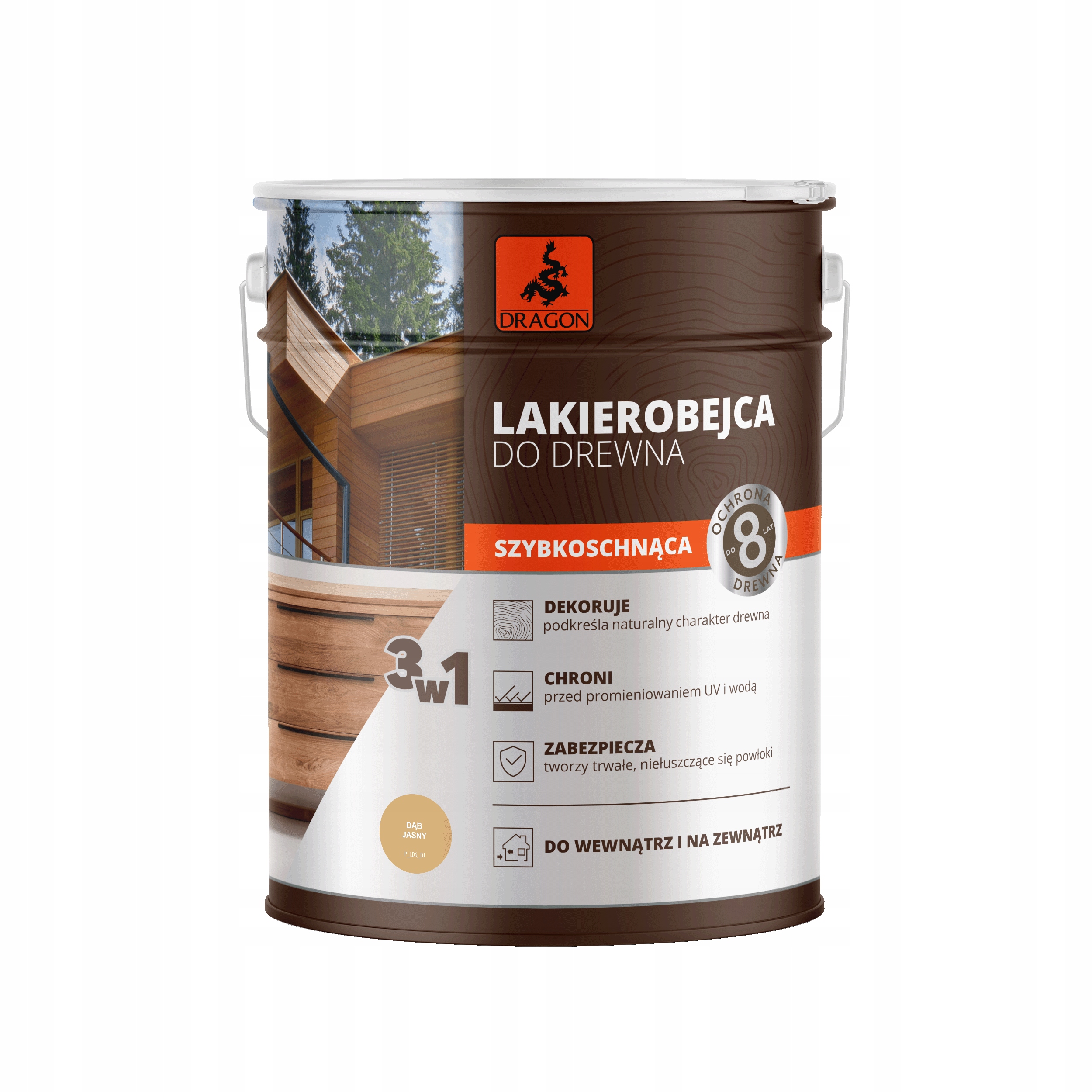 Szybkoschnąca Lakierobejca Dragon to wysokiej jakości produkt ochronno – dekoracyjny do zabezpieczenia drewna zarówno wewnątrz pomieszczeń jak i na zewnątrz. Dzięki zaawansowanej formule 3 w 1 idealnie sprawdzi się jako produkt, który impregnuje drewno, nadaje kolor i chroni na lata.
