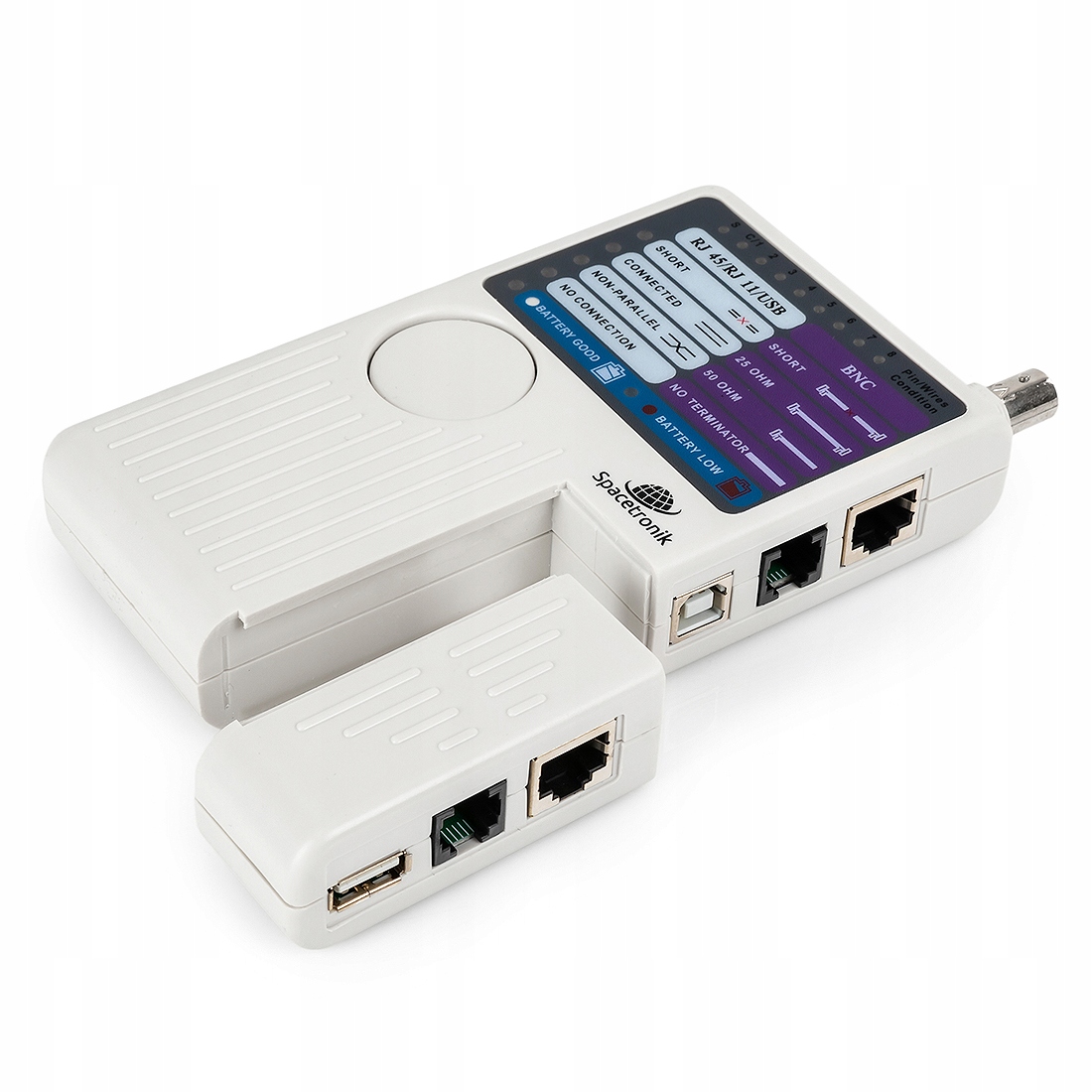 Tester LAN Spacetronik pozwala na test kabli w zakresie ciągłości obwodu, przerwy, skrzyżowania par, odwrócenia par oraz zwarcia.