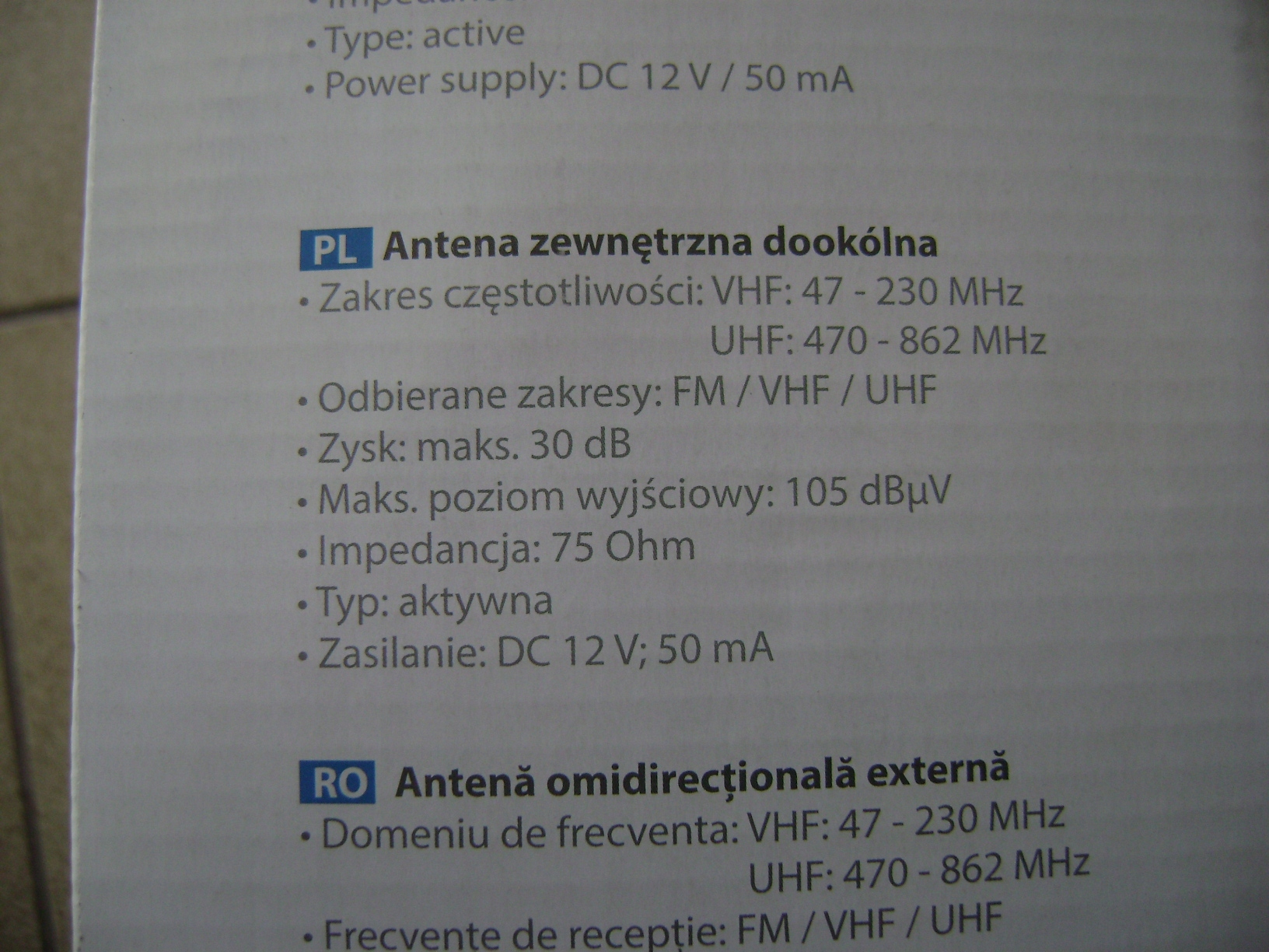 Częstotliwość pracy: VHF: 47-230 MHz, UHF: 470-862 MHz