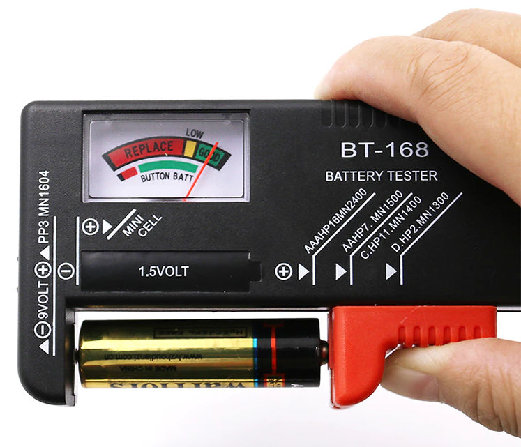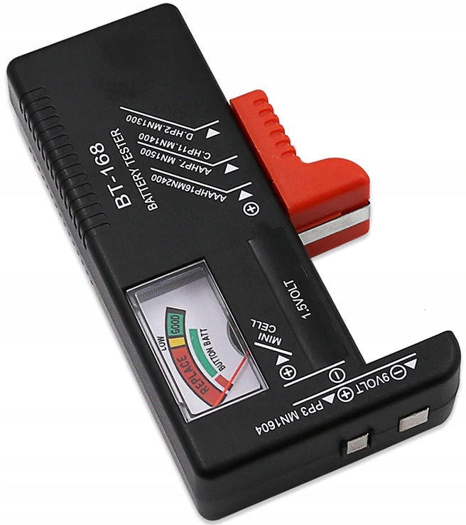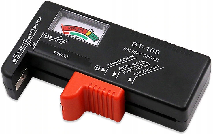 Urządzenie pozwala w bardzo łatwy sposób na sprawdzenie poziomu naładowania baterii i akumulatorków : AA R6, AAA R3, R14, R20, baterie typu pastylki 1,5V, baterie 9V (R9)