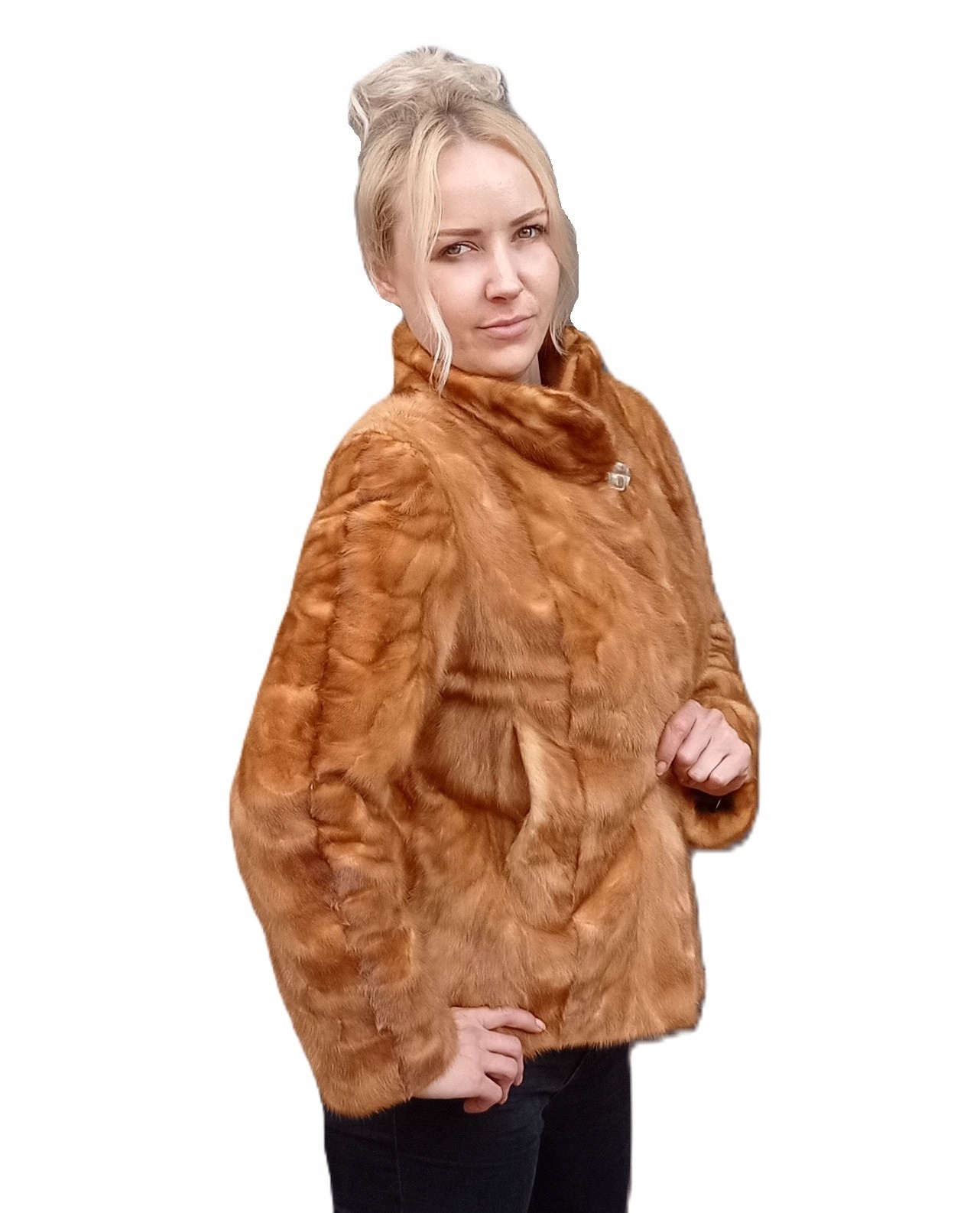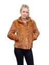 Krótka kurtka damska wykonana z wysokiej jakości naturalnego futra norek w eleganckim, rudobrązowym odcieniu.