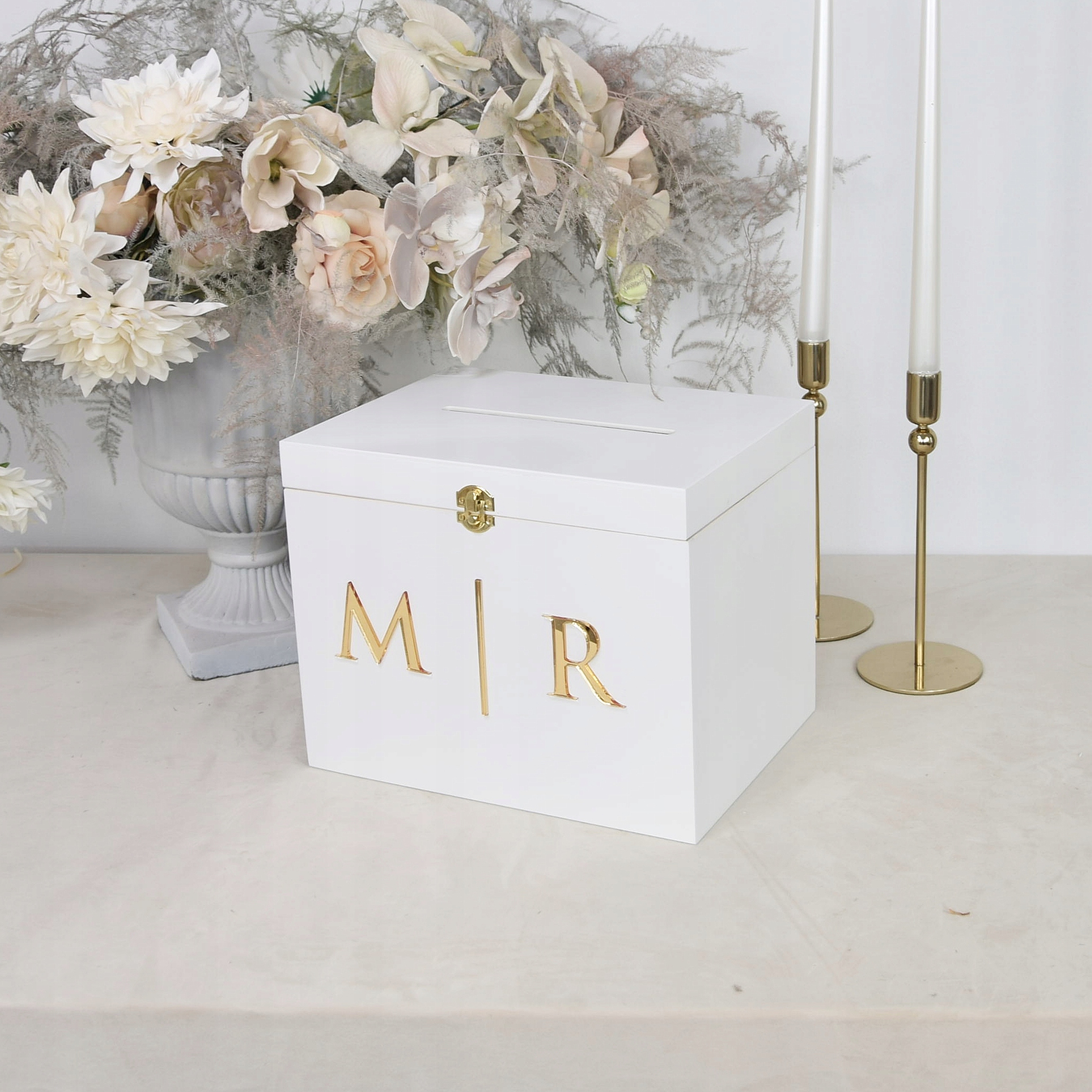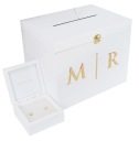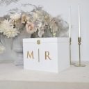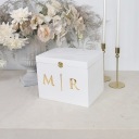 Przedstawiamy białe pudełko na koperty ślubne ze złotymi inicjałami - prawdziwą perełkę, która wprowadzi niepowtarzalny urok i luksusowy akcent na Twojej ceremonii ślubnej.