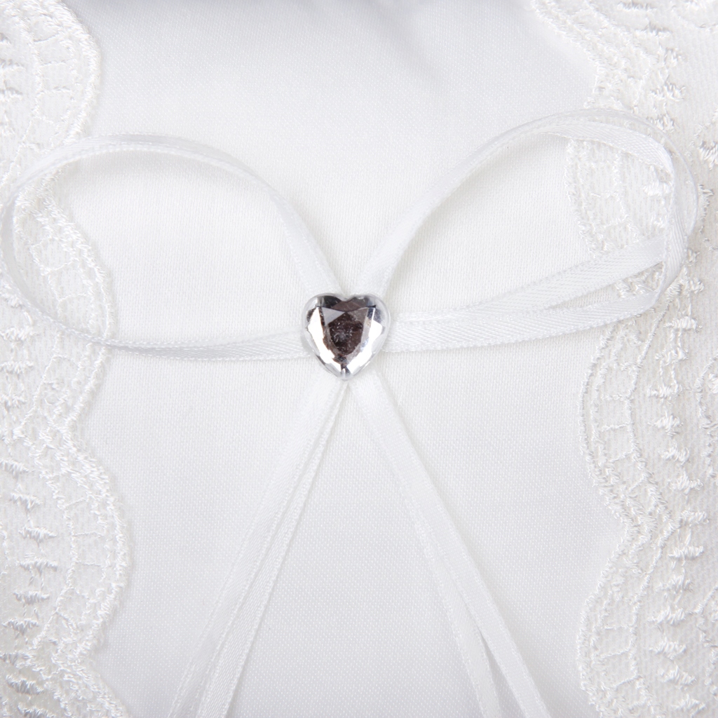 Biała poduszka na obrączki ozdobiona koronką i sercem z dżetów