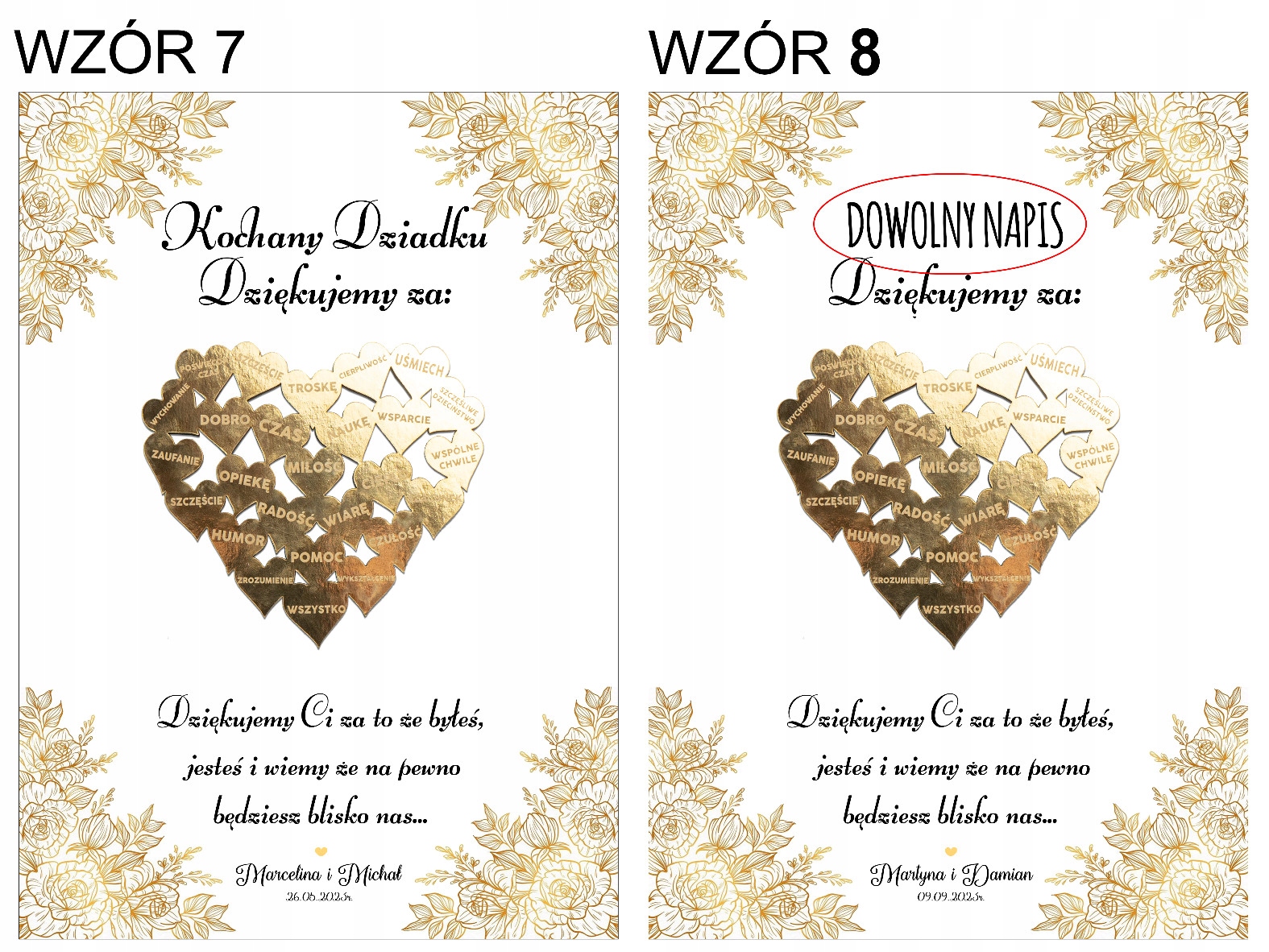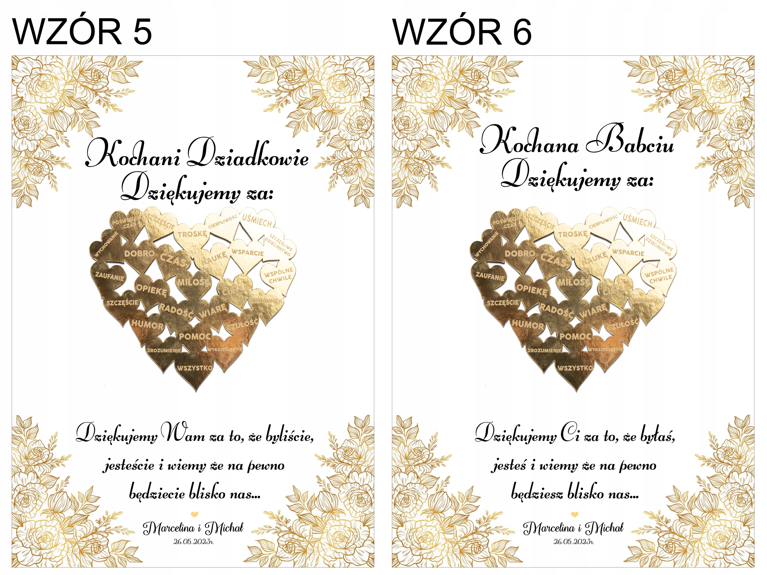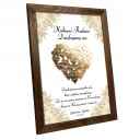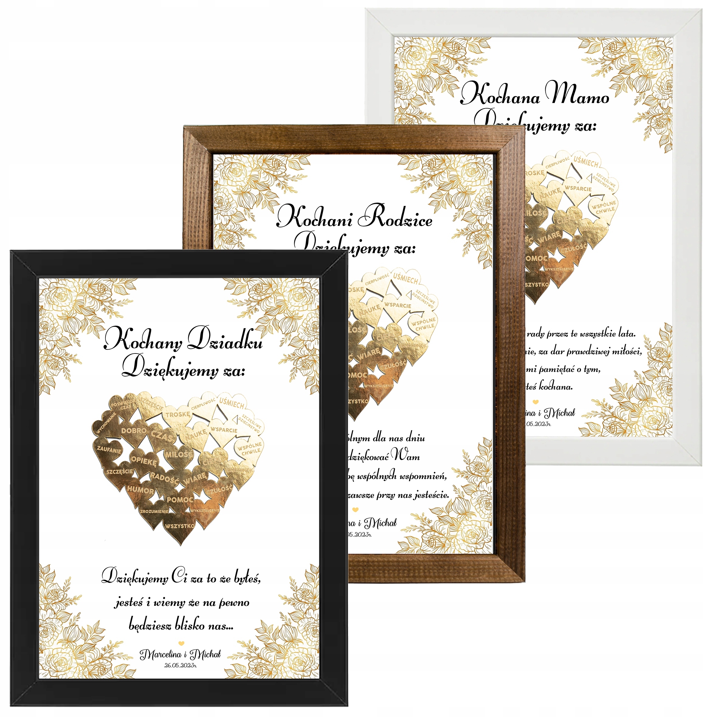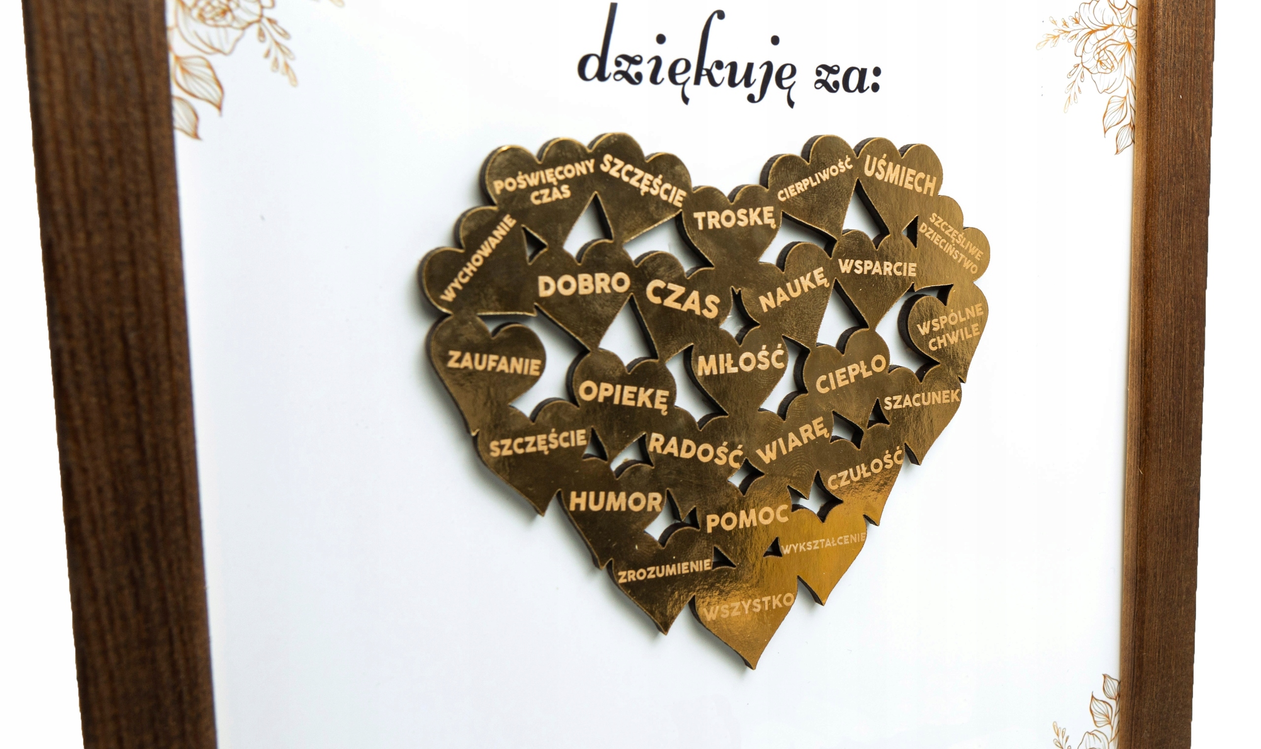 Środek ramki wypełnia ZŁOTE LUSTRZANE SERCE 3D, które składa się z mniejszych serduszek, na których wygrawerowane są teksty z podziękowaniami.