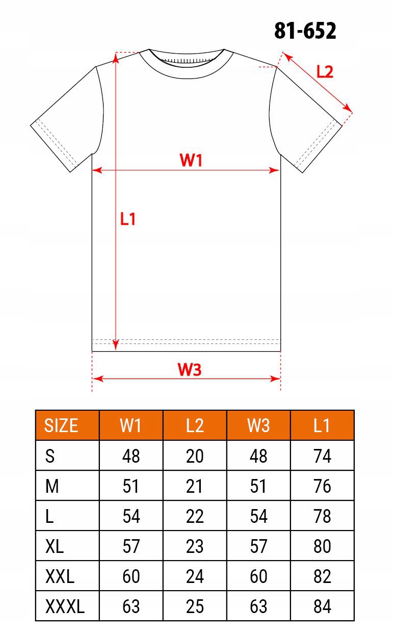Posiada krótki, praktyczny rękaw. Został wykonany ze 100% bawełny o gramaturze 180 g/m2. To single jersey – dzianina, która charakteryzuje się odpowiednim stopniem przewiewności. Materiał nie jest gniotliwy oraz doskonale nadaje się zarówno na upalne miesiące letnie jak i na każdą inną porę roku pod bluzę lub sweter.