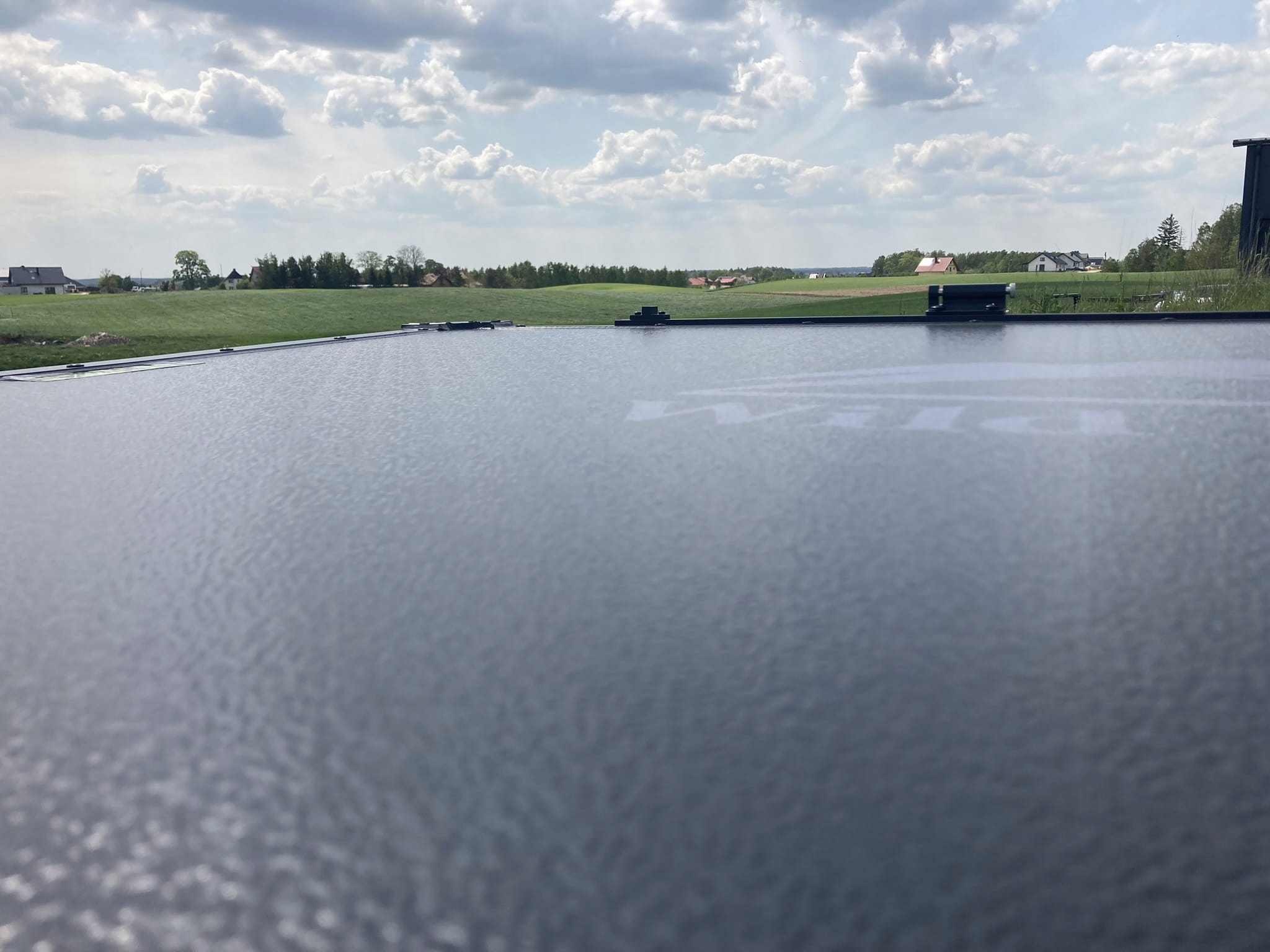 Twarda aluminiowa pokrywa osadzona jest w aluminiowej ramie, po każdej ze stron długiego boku mamy rowki T, idealne do montażu belek dachowych na namiocie. Zarówno pokrywa, jak i podłoga w środku mają izolację w postaci plastra miodu.