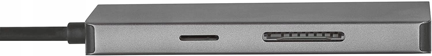 Elegancki aluminiowy adapter wieloportowy USB-C umożliwiający dodanie do laptopa złącza HDMI, sieci, czytnika kart, portów USB-C i USB-A za pomocą jednego złącza USB-C.