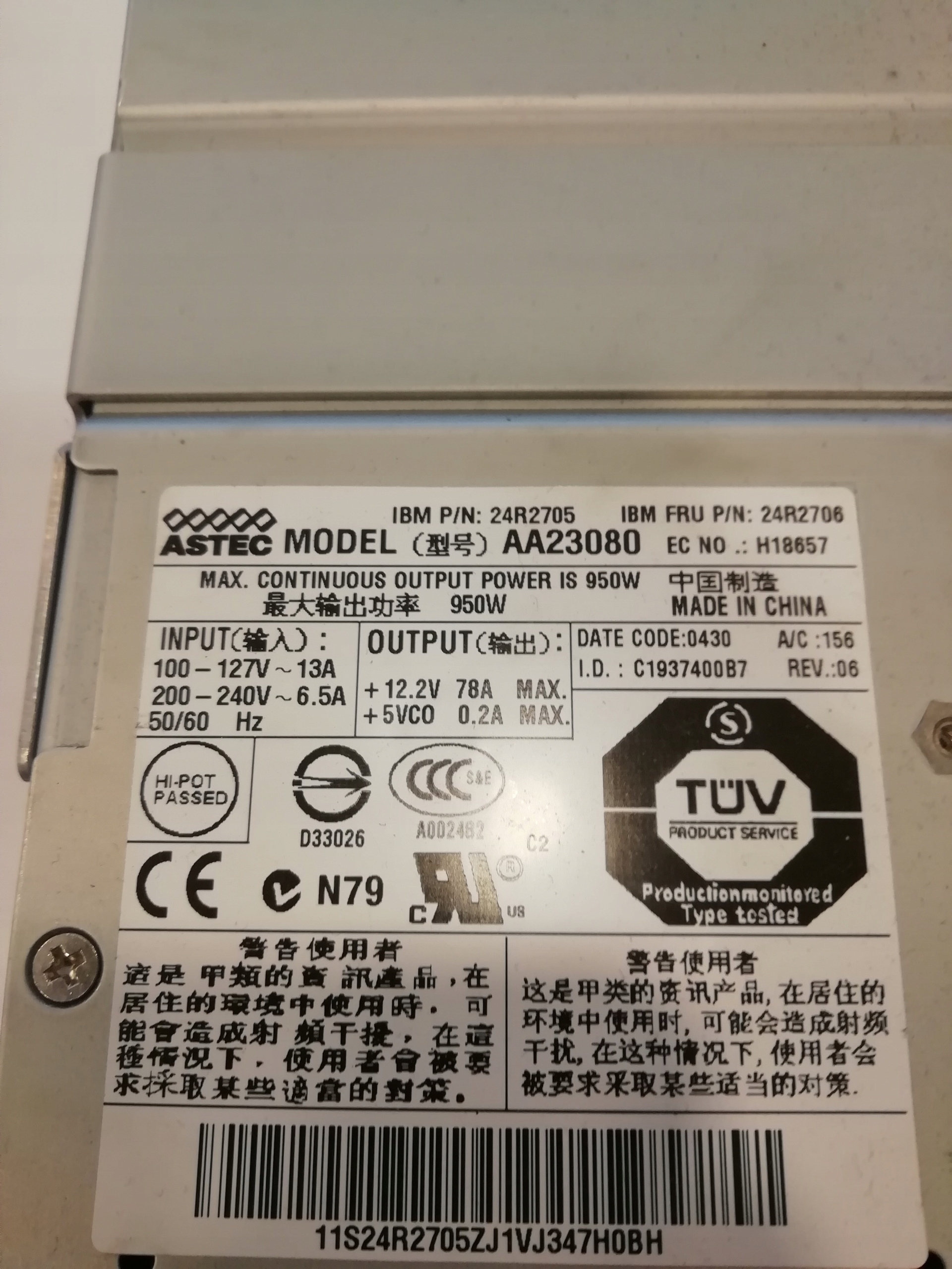 Zasilacz do serwerów IBM ASTEC AA23080 P/N: 24R2706