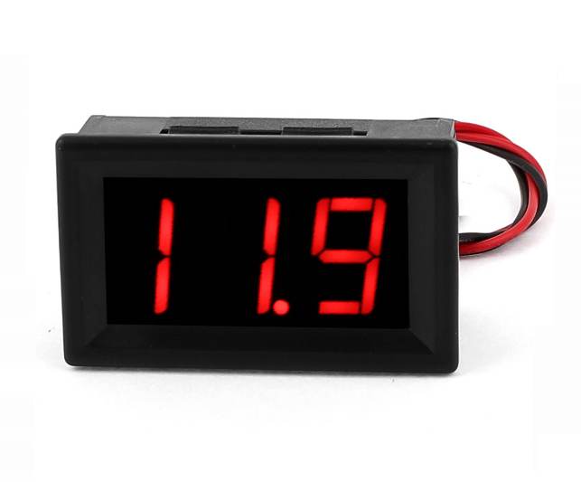 Uniwersalny czerwony trzycyfrowy woltomierz panelowy LED 0.56'' na zakres 5-30VDC z łączonym pomiarem i zasilaniem (miernik zasilany jest z mierzonego źródła ) . Przewodem czarnym ( - "masa" ) i czerwonym (+ "plus zasilania") prowadzimy zasilanie.