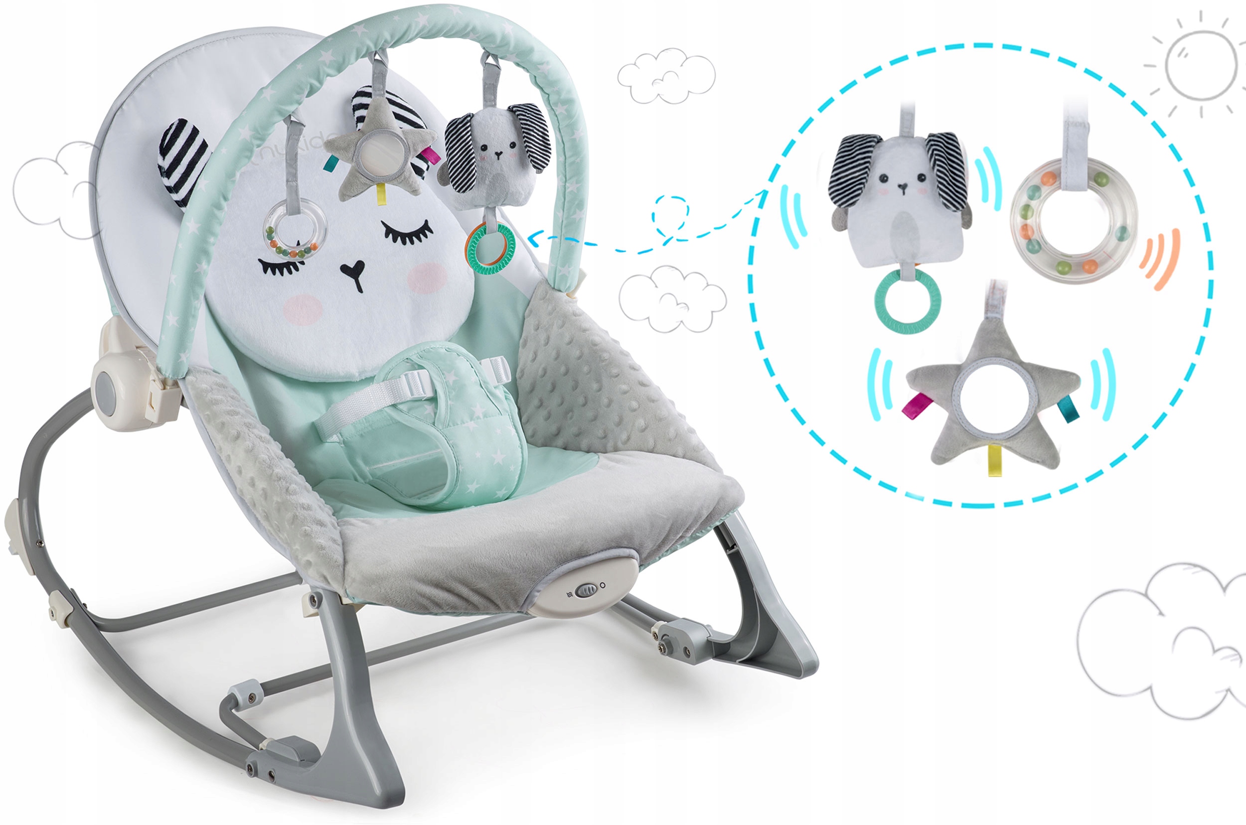 Шезлонг оснащен съемным оголовьем с прикрепленными шуршащими игрушками.. Они будут развлекать вашего ребенка, пока вы сможете отдохнуть. Эти уникальные игрушки