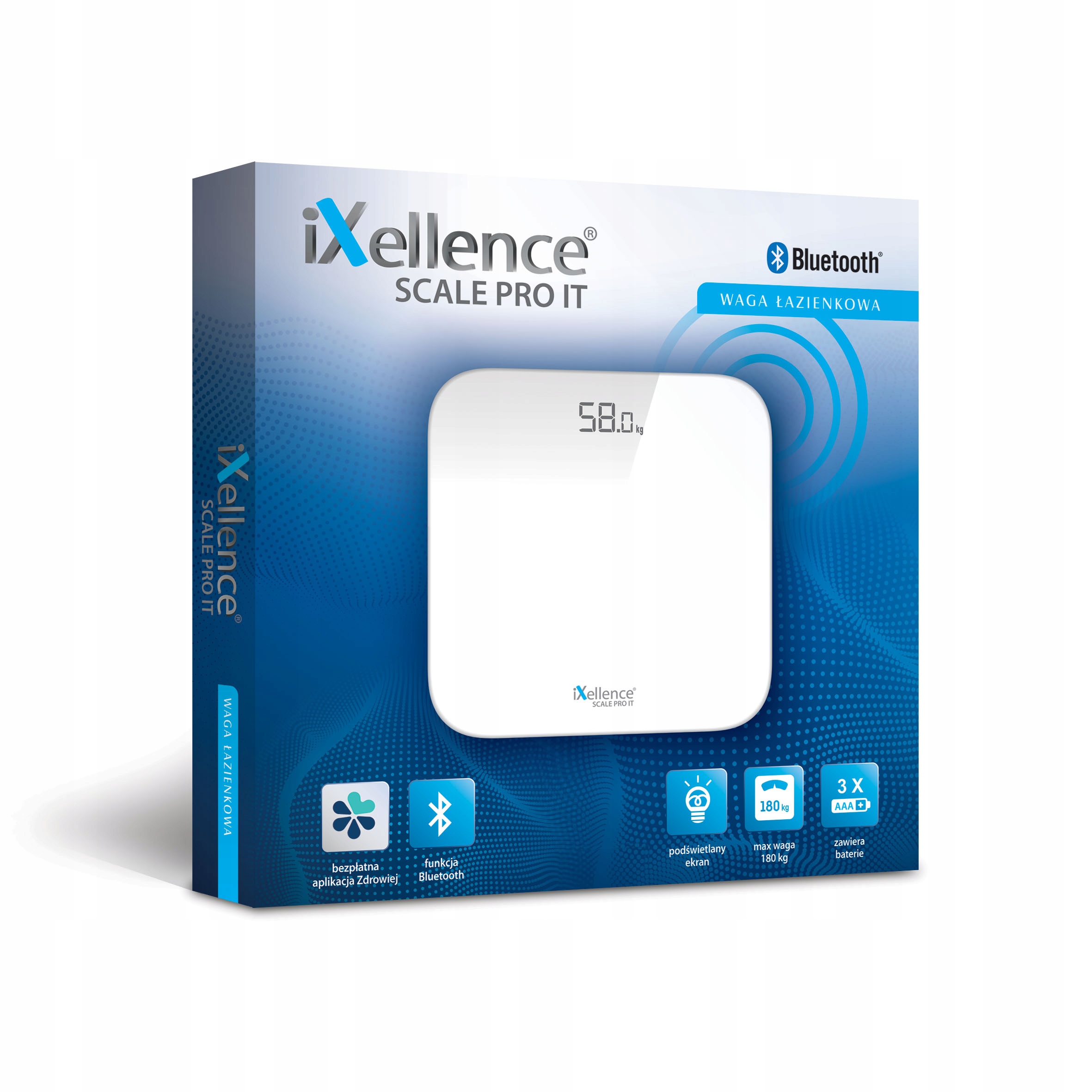 iXellence® SCALE PRO IT to zaawansowana technologicznie waga przeznaczona do domowego pomiaru masy ciała oraz masy przedmiotów od 3 kg. Waga iXellence® SCALE PRO IT wykorzystuje technologię Bluetooth dając możliwość transmisji i przechowywania danych.