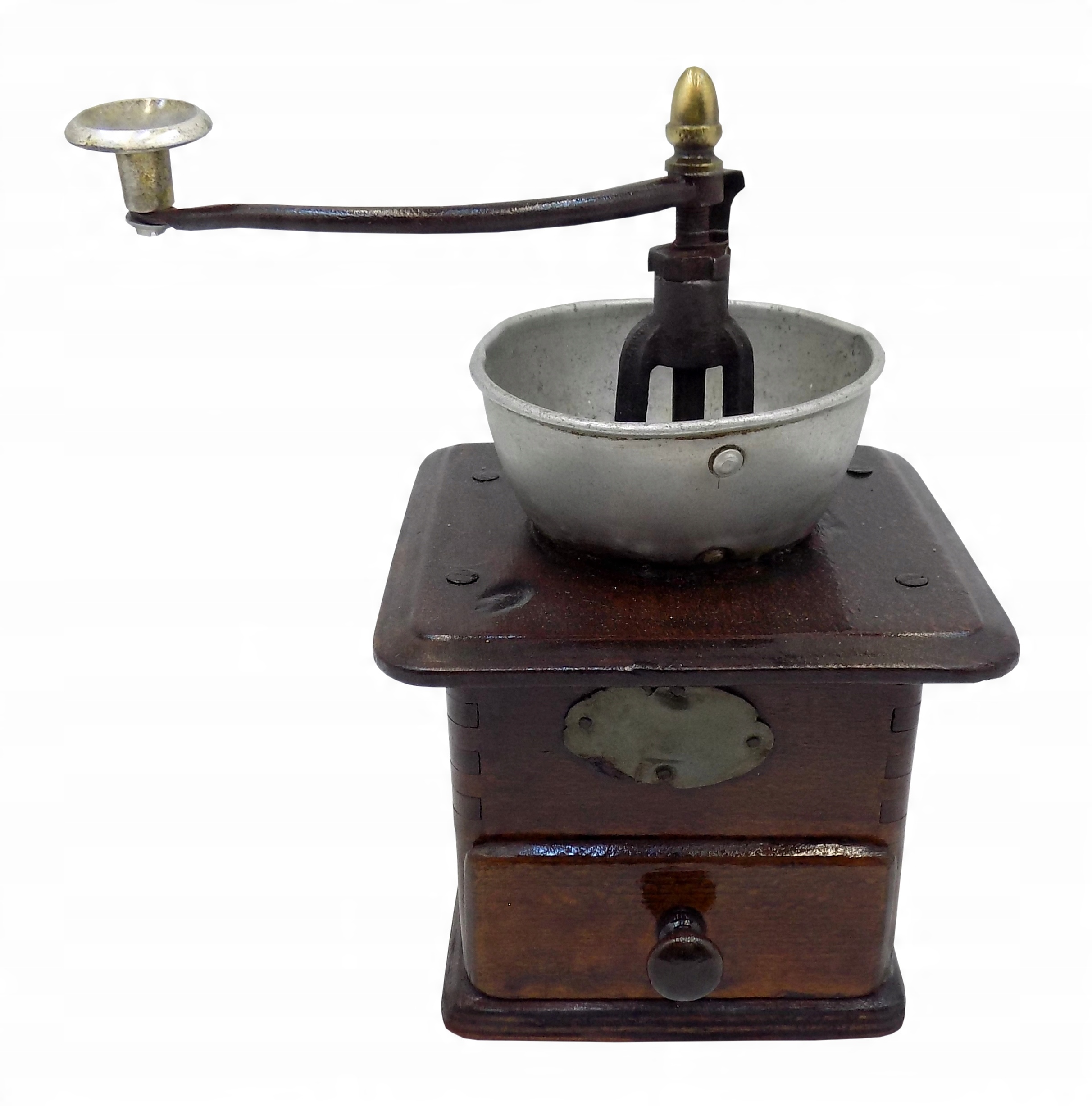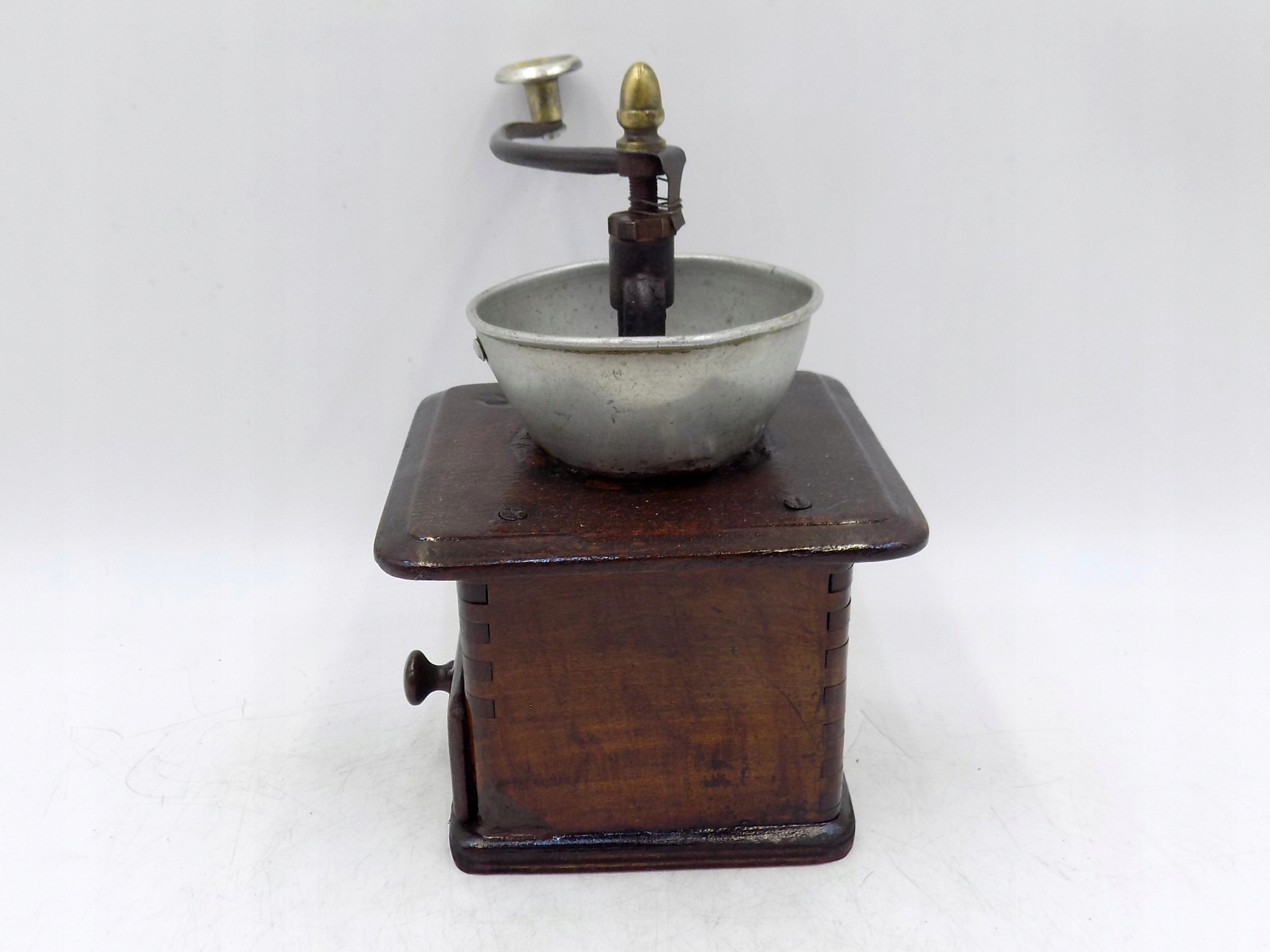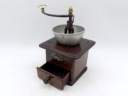 Stary młynek drewniany z wysuwaną szufladką. Wykonany w I połowie XX weku. Po renowacji. Stan młynka dobry pokazany na zdjęciach. Wymiary; wys. 20 x 20 x 14 cm