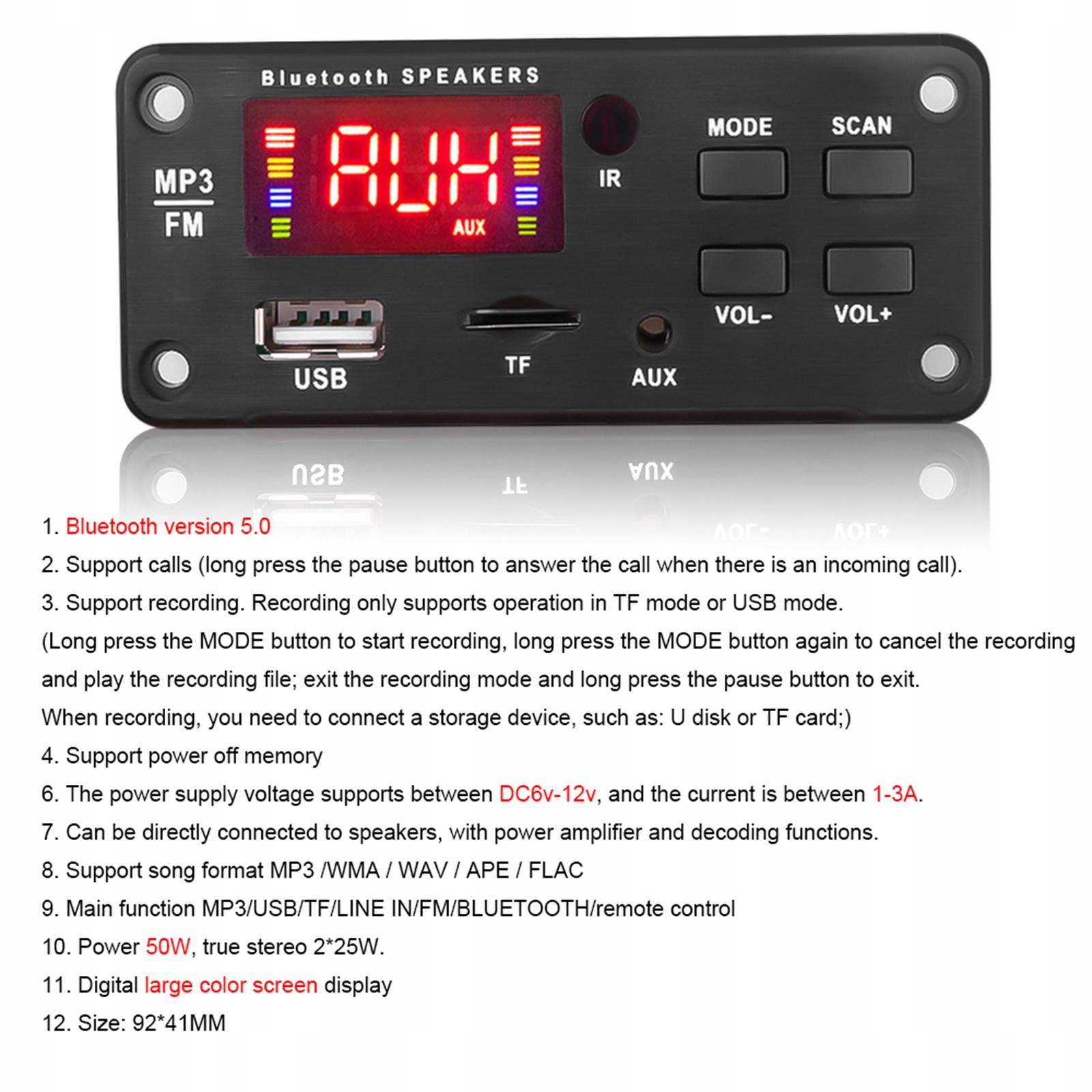 Wysoce zintegrowana płyta audio MP3, obsługuje przełączanie USB /TF / /FM /AUX, wybór folderów i odtwarzanie. Obsługa MP3 /WAV /APE / format muzyki.