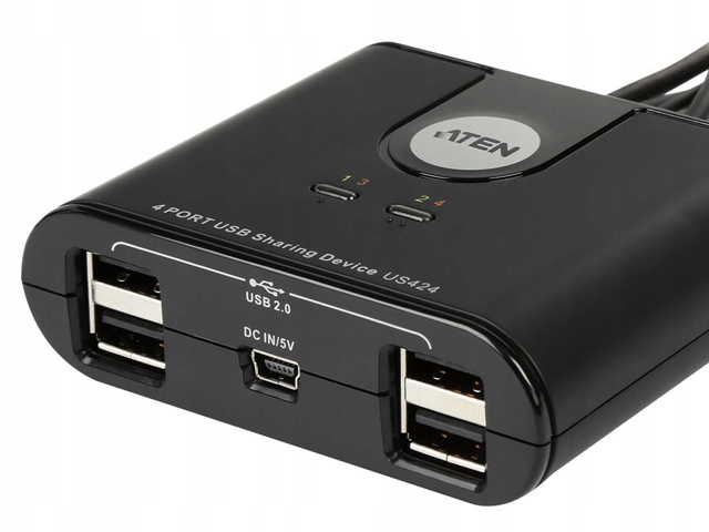 To pozwala 4 komputerom współdzielić 4 urządzenia USB - klawiaturę USB, mysz i do dwóch urządzeń peryferyjnych USB.