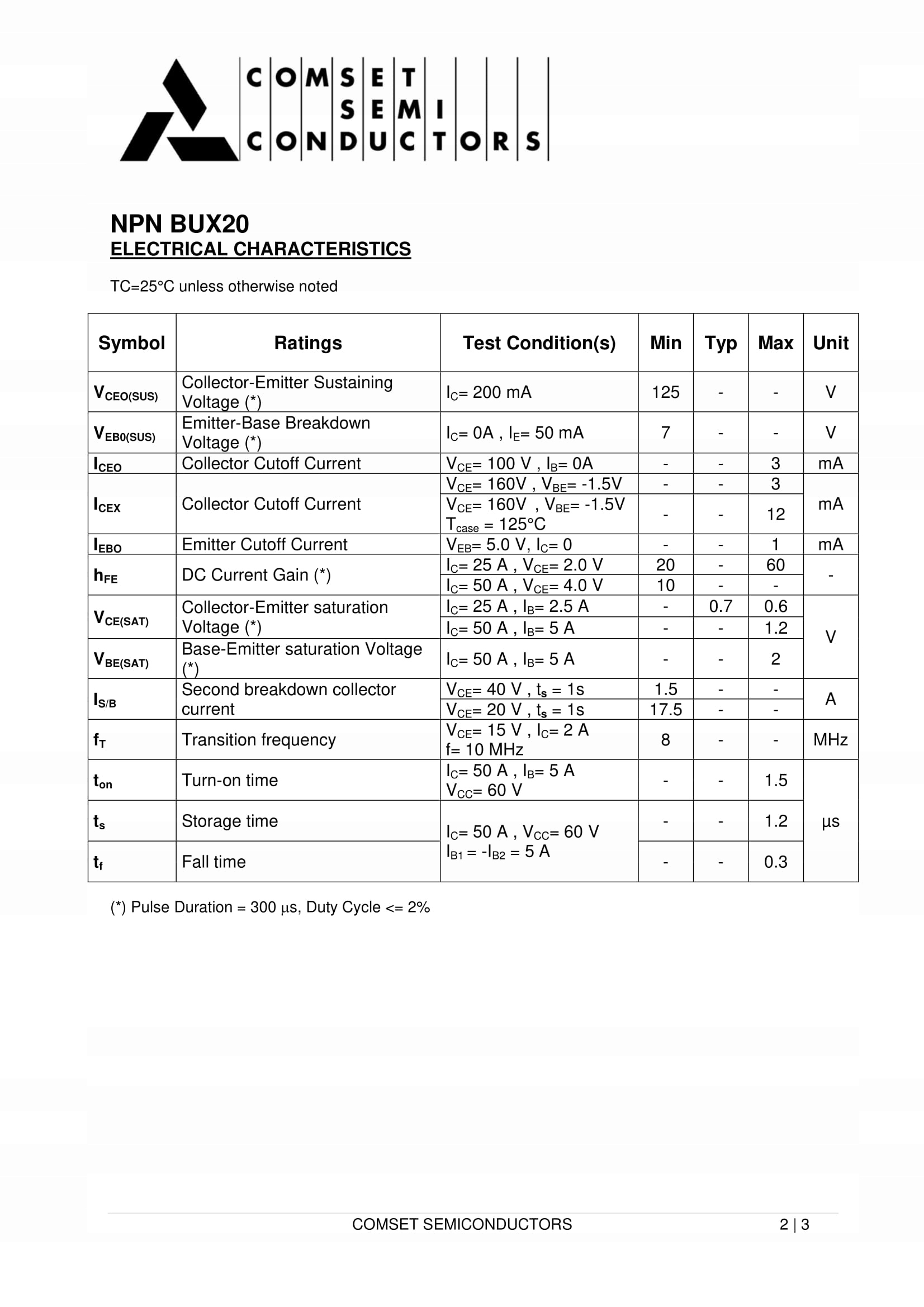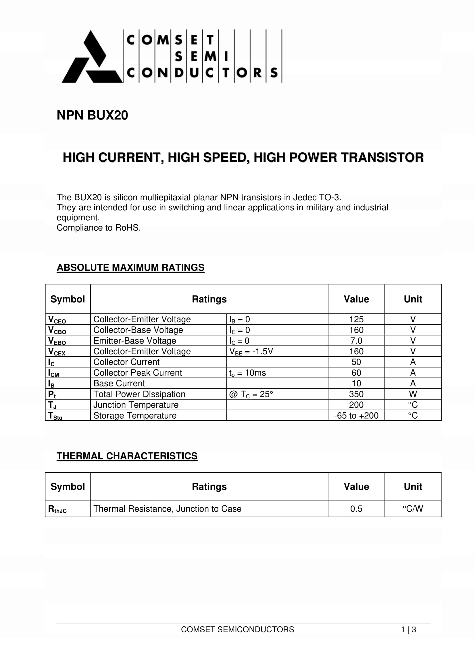 Максимальная потеря мощности 350 Вт, максимальный непрерывный ток коллектор 50а, максимальный ток базы 10А, максимальное напряжение CE 125В.
