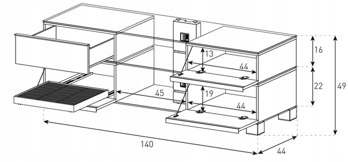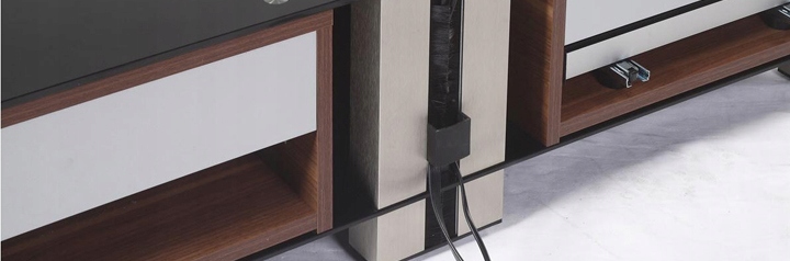 Одной из уникальных особенностей стола является система управления кабелями, она позволяет эстетически скрытие силовых или сигнальных кабелей от телевизора, в то же время дает нам быстрый доступ к их. Второе важное конструктивное решение - открытая наполовину задняя часть шкафа, которая обеспечивает вентиляцию внутри оборудования.