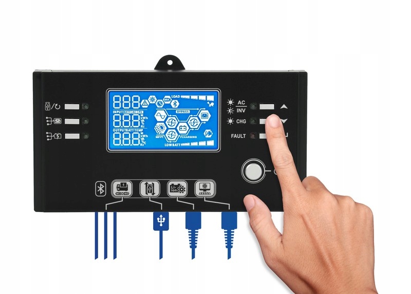• Wyświetlacz LCD, informujący o aktualnym stanie pracy urządzenia m.in. napięciu wejściowym i wyjściowym, napięciu i ładowaniu baterii