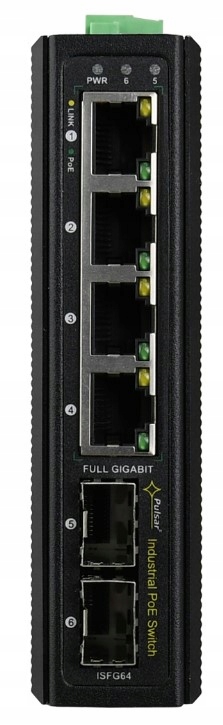 Switch Pulsar ISFG64 to 6-portowy switch PoE przeznaczony do zasilania kamer IP pracujących w standardzie IEEE 802.3af/at.