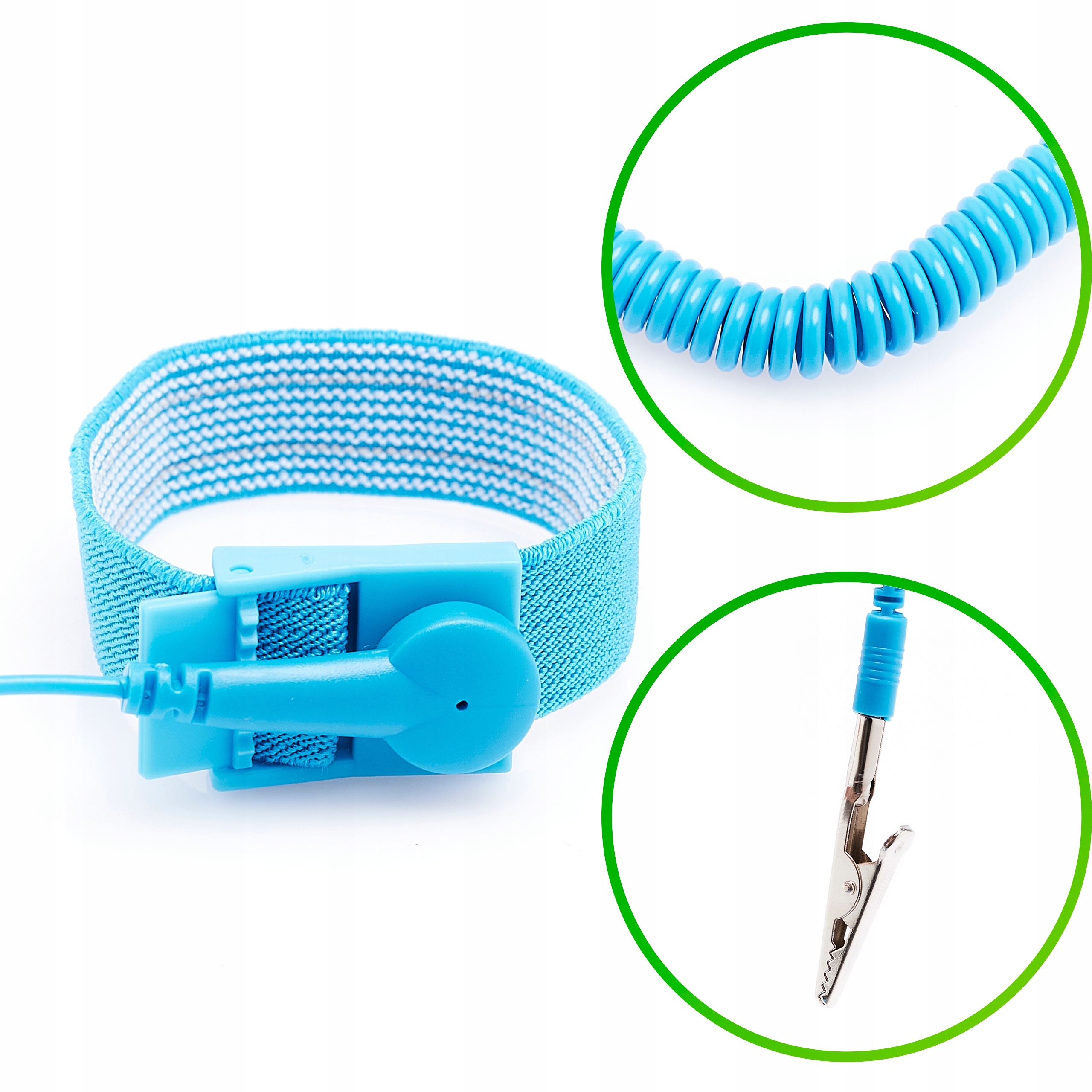 Antystatyczna opaska na nadgarstek jest najpopularniejszym i podstawowym produktem antystatycznym, który jest szeroko stosowany w przemyśle SMT i na linii produkcyjnej. Jest łatwa w użyciu i ekonomiczna. Zasadą jest, że elektryczność statyczna na ciele ludzkim jest odprowadzana do ziemi przez opaskę na rękę i przewód uziemiający, dlatego podczas użytkowania ludzka skóra musi stykać się z opaską, a drut uziemiający musi być bezpośrednio uziemiony, co zapewnia skuteczność. Użytkownik ma zapewnioną swobodę ruchów dzięki długiemu spiralnemu przewodowi o całkowitej długości 1,8m.