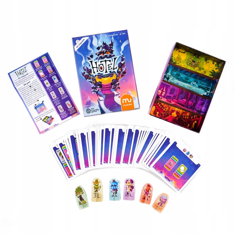 Poprowadź hotel dla potwornie wymagających gości. Ulokuj ich w pokojach, które spełnią ich wyśrubowane oczekiwania. Każdy z gości ma własne życzenia - niektórzy będą chcieli być ulokowani tylko na wybranym piętrze, inni nie pogardzą towarzystwem mumii, a jeszcze inni będą chcieli mieć pokój wyłącznie dla siebie. Zmierz się z 60 wyzwaniami o narastającym poziomie trudności - każda łamigłówka ma wyłącznie jedno dobre rozwiązanie!Hotel to kompaktowa, kolorowa pozycja dla 1 gracza, która będzie doskonałym prezentem dla fanów łamigłówek i logicznych wyzwań. Dzięki zróżnicowanemu poziomowi trudności nie będą nudzić się tu ani siedmiolatki, ani dorośli gracze. Autor: Yoann Levert Ilustracje: Rémi Leblond Dlaczego warto: kompaktowy format - pudełko jest częścią gry sympatyczna i kolorowa oprawa graficzna zróżnicowany poziom trudnościGra rozwija: logikęspostrzegawczośćkoncentracjęZawartość opakowania:6 tekturowych potworków 60 kart z zagadkami InstrukcjaWymiary pudełka:15,3 x 10,8 x 3,5 cm