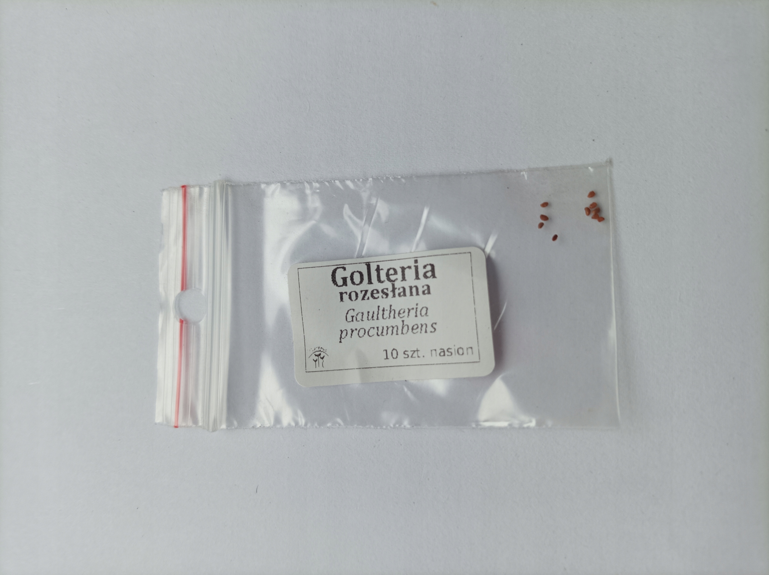 Golteria rozesłana to niska krzewinka o wysokości 10-15cm, ładnie wyglądająca nawet zimą, rozrastająca się za pomocą podziemnych rozłogów, jednak nie jest ekspansywna i charakteryzuje się wolnym tempem wzrostu tworząc zwarte kobierce Wyprostowane, bardzo cienkie pędy dorastają do 10 centymetrów wysokości. Ciemnozielone, skórzaste i błyszczące listki mają długość około 3-5 centymetrów, są skrętolegle osadzone na łodydze. Młode przyrosty często przyjmują czerwonawy lub brązowy odcień. Jesienią i zimą liście wybarwiają się na lekko bordowy kolor. Z kątów liści wyrastają białe lub lekko różowe, beczułkowate kwiaty wydzielające delikatny zapach. Kwitnie od lipca do sierpnia. Podobne do jagód owoce zawiązują się już w sierpniu. Dojrzałe owoce osiągają średnicę około jednego centymetra, ich skórka jest czerwona i błyszcząca. Wewnątrz są białe, gąbczaste i silnie aromatyczne (pachną kamforą). Owoce utrzymują się na pędach aż do wiosny. Najlepiej czuje się w towarzystwie innych roślin kwasolubnych, preferujących taki sam odczyn podłoża i zapewniających jej osłonę przed słońcem oraz wysuszającym wiatrem. Gatunek ten ma też właściwości lecznicze (pozyskany z rośliny olejek ma działanie przeciwbólowe i odkażające), a jego liście są wykorzystywane w niektórych rejonach świata do przygotowywania naparów i herbatek. Ich delikatny, kamforowy aromat jest też ceniony w kosmetyce i ma zastosowanie przy produkcji perfum oraz kosmetyków. Opakowanie zawiera 10szt nasion.
