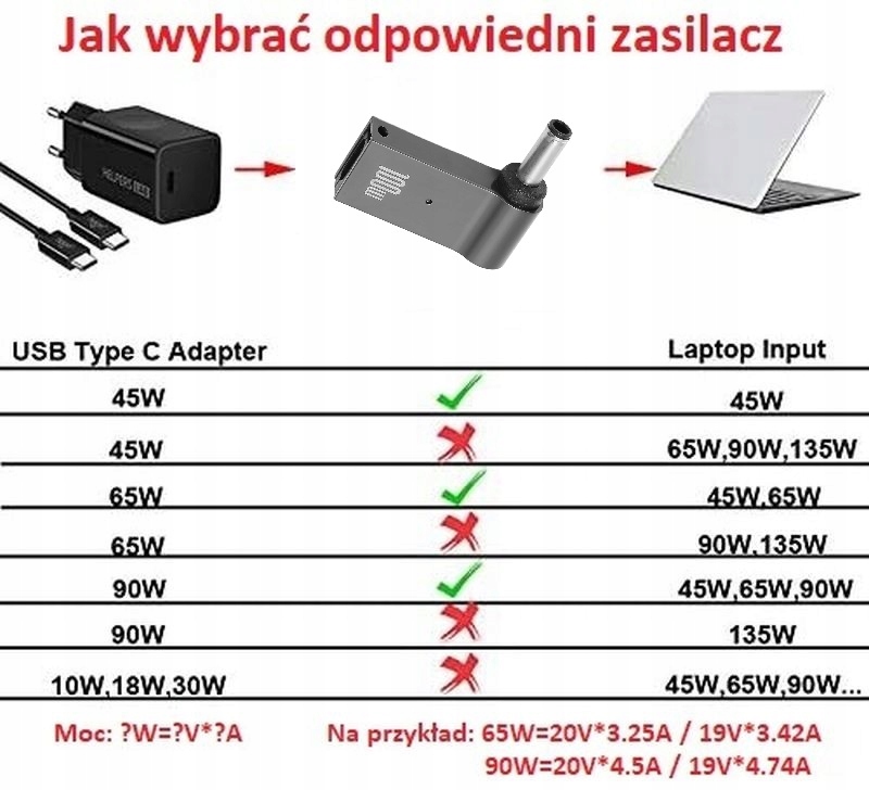 Adapter wykonano z myślą o ładowaniu laptopów DELL ze złączem 4,5x3,0mm przy pomocy uniwersalnego zasilacza z wtyczką USB-C. Dzięki zgodności ze standardem Power Delivery (PD), przejściówka pozwoli naładować laptopa napięciem z przedziału od 18.5 V do 20 V i mocą do 100W. Adapter do poprawnego działania wymaga ładowarki, oraz przewodu z obsługą standardu Power Delivery (PD) z odpowiednio dużą generowaną mocą - najlepiej taką samą, lub większą, jak oryginalny zasilacz do laptopa.