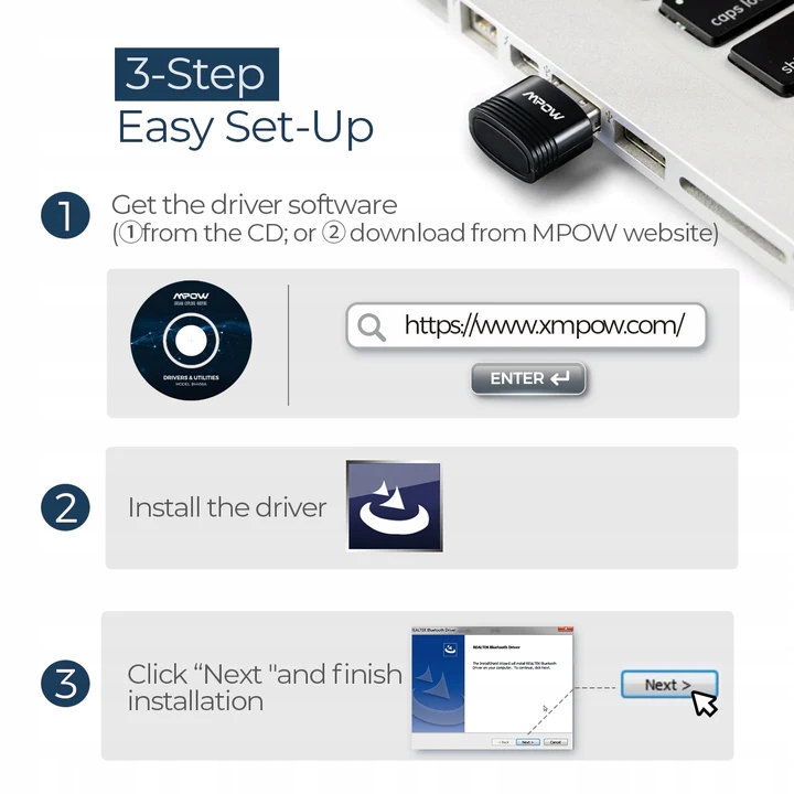 BLUETOOTH 5.0: Z zainstalowanym chipem Bluetooth 5.0, adapter USB Bluetooth Mpow ma lepszą wydajność niż poprzednia wersja pod względem szerszej odległości transmisji (66 stóp), większej szybkości transmisji danych (2 Mbps) i mniejszego zużycia energii.