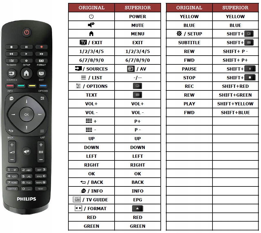 Потому что у пилота может быть много в заменяющем пульте вы найдете Shift кнопка, которая позволяет удвоить число кнопки на пульте дистанционного управления. Наиболее распространенные функции обычно выполняются прямым нажатием (нажатием одной кнопки), в то время как менее типичные функции обычно выполняются с помощью кнопки Shift, а затем другой кнопки. Например, если вы нажмете красный кнопка, когда мы находимся в телетексте, мы выполним функцию, одновременно нажав кнопку Shift, итогда красный мы получим еще одну другую функцию. Также следует отметить, что такие кнопки, как цвета на телевизоре имеют функции телетекстовой навигации, тогда как если пульт дистанционного управления запрограммирован на DVD те же кнопки имеют другие функции, потому что DVD не имеет телетекста.