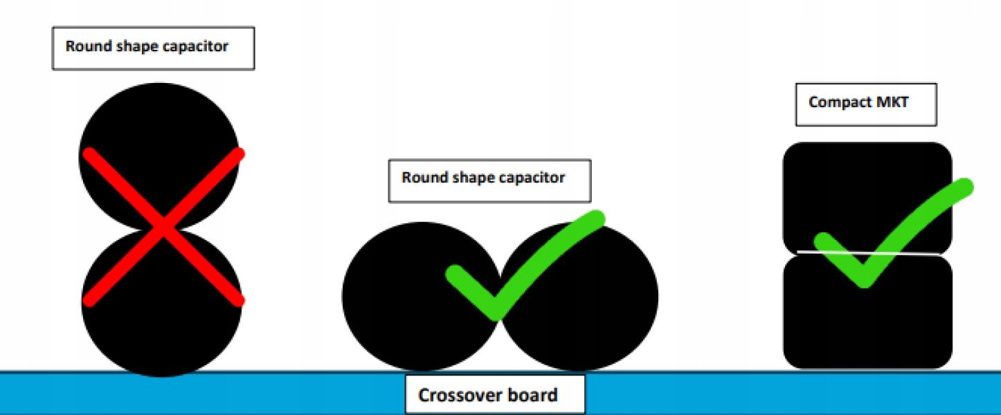 Kondensatory Jantzen Audio Compact MKT wykonane są z najwyższej jakości metalizowanej folii poliestrowej. Udało się zmniejszyć ich rozmiar i uzyskać lepszy dźwięk w porównaniu do kondensatorów elektrolitycznych typu „zwykła/gładka folia”. Dzięki napięciu znamionowemu 160 V DC są one również bardziej wszechstronne w użyciu niż kondensatory elektrolityczne, które zwykle mają wartości znamionowe od 63 do 100 woltów prądu stałego. Dzięki zaokrąglonemu kwadratowemu kształtowi (płaska powierzchnia górna i dolna) można łatwo układać je w stosy, gdy konieczne jest połączenie wielu kondensatorów równolegle, aby osiągnąć wyższą wartość pojemności. Ponieważ można je układać jeden na drugim, zajmują znacznie mniej miejsca w porównaniu do okrągłych odpowiedników kondensatorów elektrolitycznych, foliowych MKT lub PP, które należy montować jeden obok drugiego.