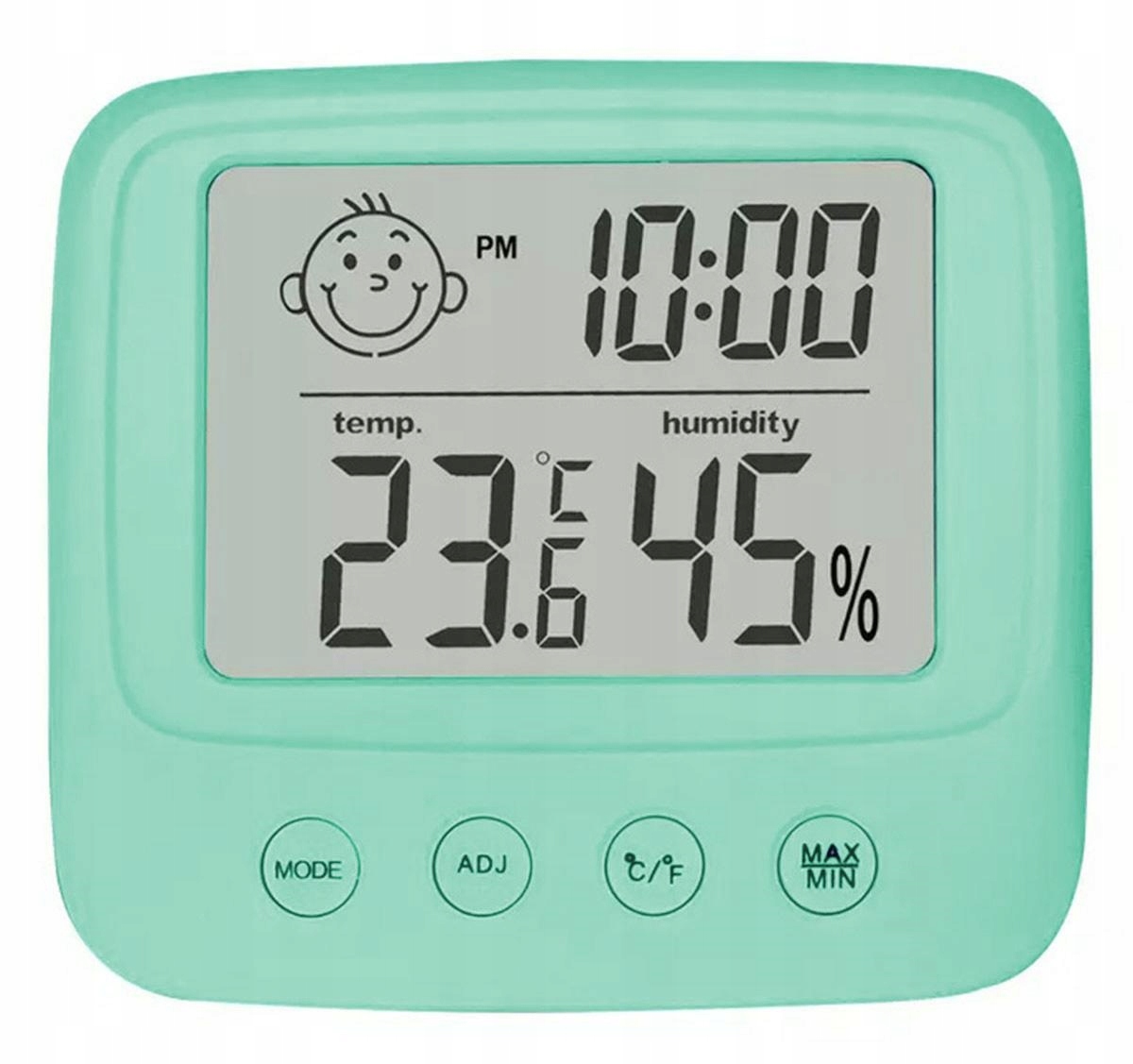 Wewnętrzna, elektroniczna stacja pogody z wbudowanym czujnikiem temperatury oraz higrometrem - niezwykle przydatna w każdym domu, szczególnie w pokoju dziecka, gdzie kluczowe jest utrzymanie odpowiedniej temperatury oraz wilgotności powietrza. Wyposażona w duży, czytelny wyświetlacz LCD, który wskazuje wszystkie najważniejsze pomiary oraz ogólny komfort w pomieszczeniu. Wygodne przyciski funkcyjne ułatwiają obsługę urządzenia. Prosty montaż dzięki taśmie samoprzylepnej na odwrocie obudowy. Specjalna podstawka umożliwiają ustawienie urządzenia na blacie mebla.