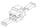 Konstrukcja łącznika umożliwia proste (przez zatrzask) mocowanie w uchwytach typu KEYSTONE. Uchwyty takie stosowane są osprzęcie teleinformatycznym (np. puszki, ramki, adaptery, panele RACK). Przykładowe rozwiązania puszek, ramek, adapterów i paneli z wpiętymi złączami typu KEYSTONE prezentujemy na poniższych przykładach:
