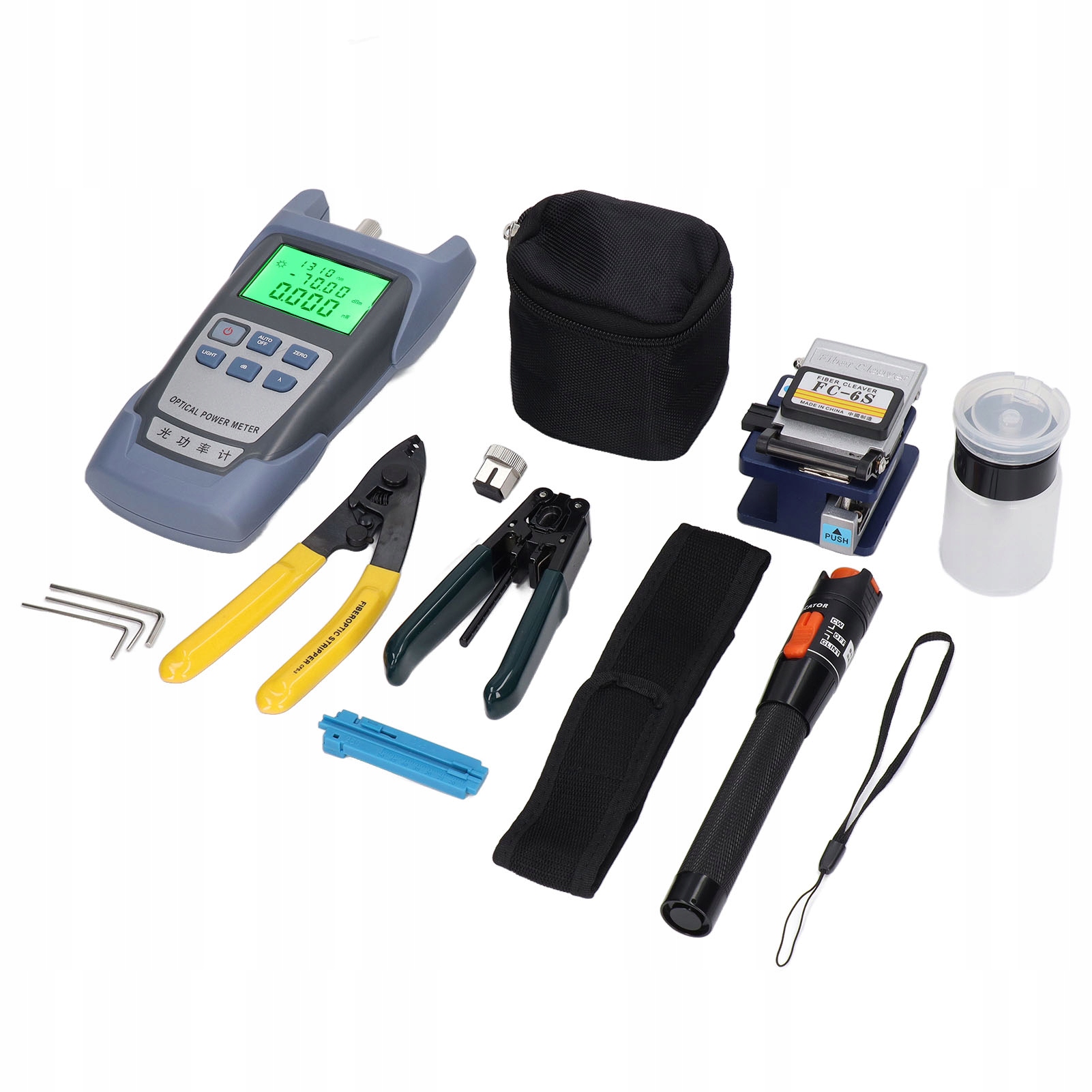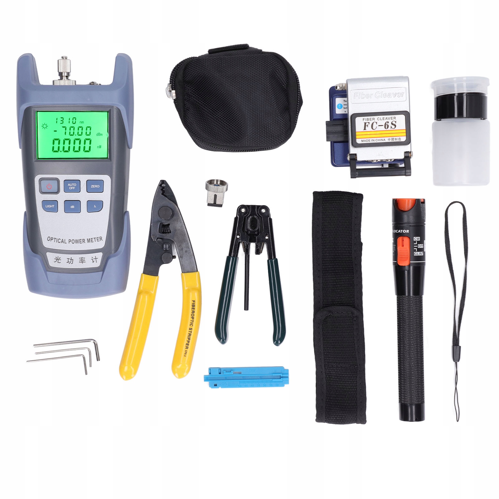 ✅Разное инструменты: набор оптических тестеров из 15 предметов, включая различные инструменты, такие как Кливер волоконно-оптический, инструмент для зачистки проводов, инструмент для фиксации длины, шестигранный ключ и т.д.