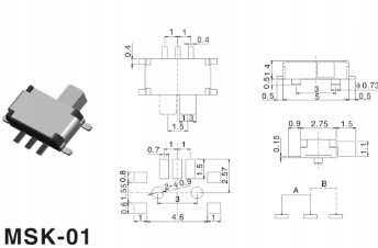 Przełącznik suwakowy; 2-pozycyjny. Może przełączać napięcie do 50 V i prąd do 0,5 A. SPDT.