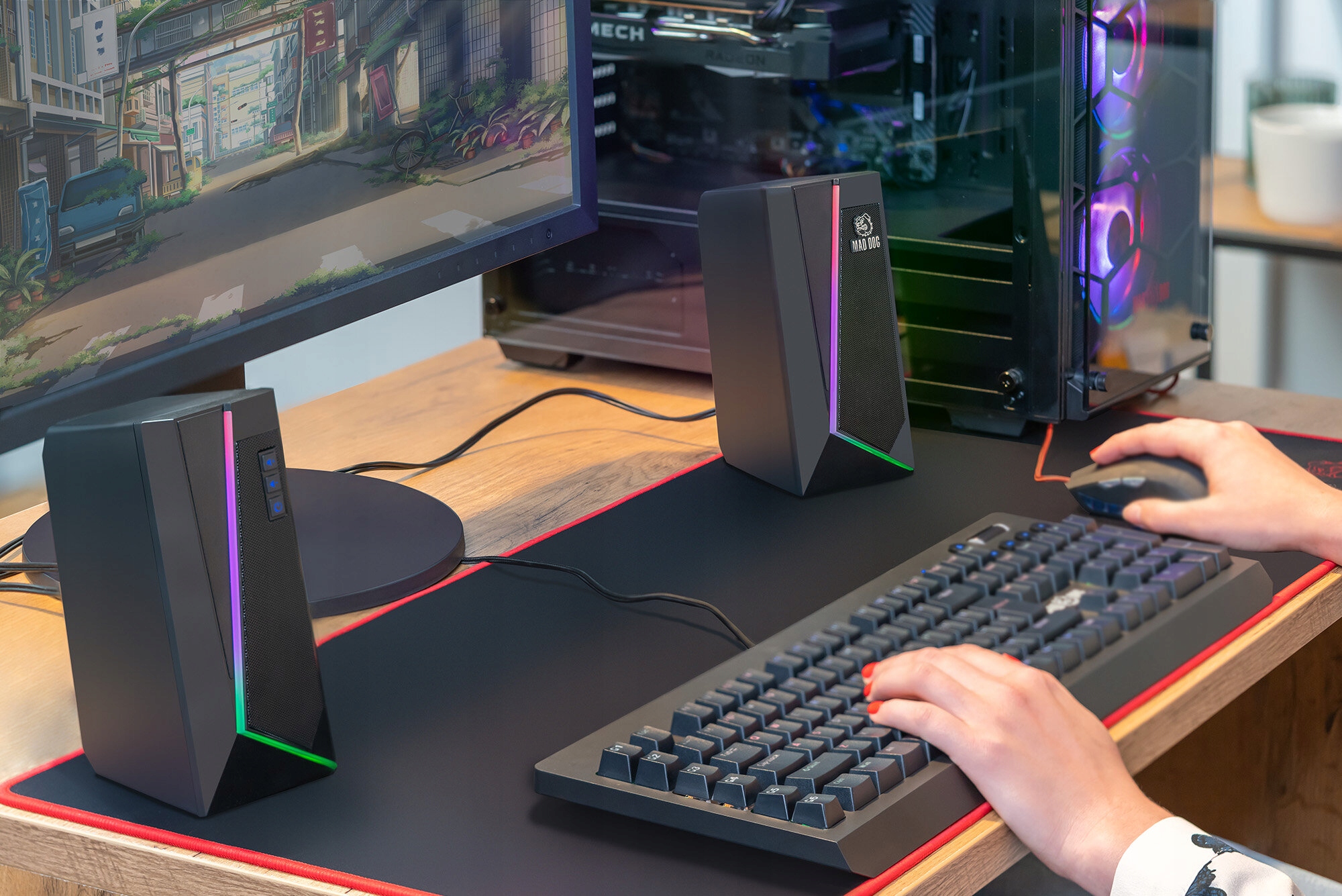 Głośniki MAD DOG PGS500 to doskonałe uzupełnienie Twojego gamingowego setu. Zasilane przez złącze USB-A głośniki możesz podłączyć do sprzętu na wiele sposobów - bezprzewodowo, dzięki stabilnemu połączeniu Bluetooth 5.0, albo wybrać połączenie przewodowe przez miniJack 3,5 mm. Możesz podłączyć do nich jednocześnie np. konsolę i komputer, żeby zmieniając tryb, przełączać dźwięk między nimi.