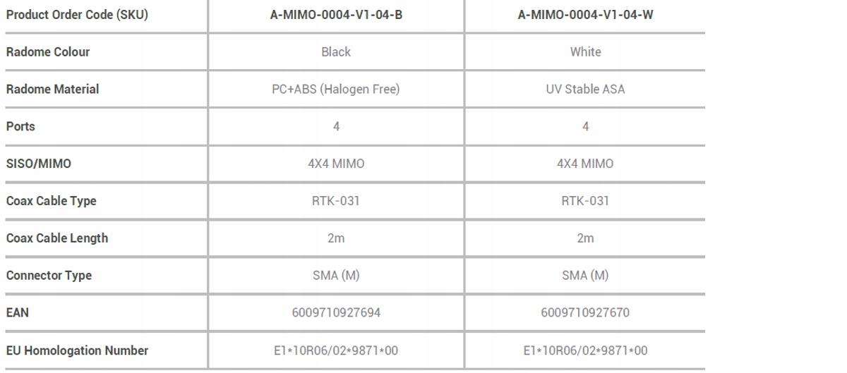 MIMO-4-4 to wysokowydajna antena wieloczęstotliwościowa 4 w 1 z czterema antenami komórkowymi w jednej obudowie. Cztery anteny komórkowe MIMO oferują zasięg szerokopasmowy od 617 do 6000 MHz, obejmujący współczesne pasma LTE/4G i 5G, co pozwala na przyszłościowe wdrożenia. Ultraszerokopasmowa wydajność anten komórkowych pozwala na ich stosowanie u różnych operatorów i w różnych technologiach oraz jest gotowa na przyszłe technologie komórkowe do 6 GHz w zastosowaniach 5G. MIMO-4-4 przewyższa wydajność większości konkurentów dzięki dbałości o konstrukcję tej anteny o wysokiej wydajności. Wzory promieniowania wszystkich elementów promieniujących zapewniają doskonałą równowagę pomiędzy dookólnością, różnorodnością wzorców i dobrymi właściwościami promieniowania na pożądanej wysokości. Jest to ważne kryterium dla rynku transportowego i morskiego, dla którego antena została specjalnie zaprojektowana. Główne zastosowania dotyczą pojazdów użytkowych/przemysłowych, statków, M2M i innych systemów IoT wykorzystujących szeroką gamę technologii radiowych, zachowując jednocześnie przyszłość w szerokim paśmie częstotliwości.