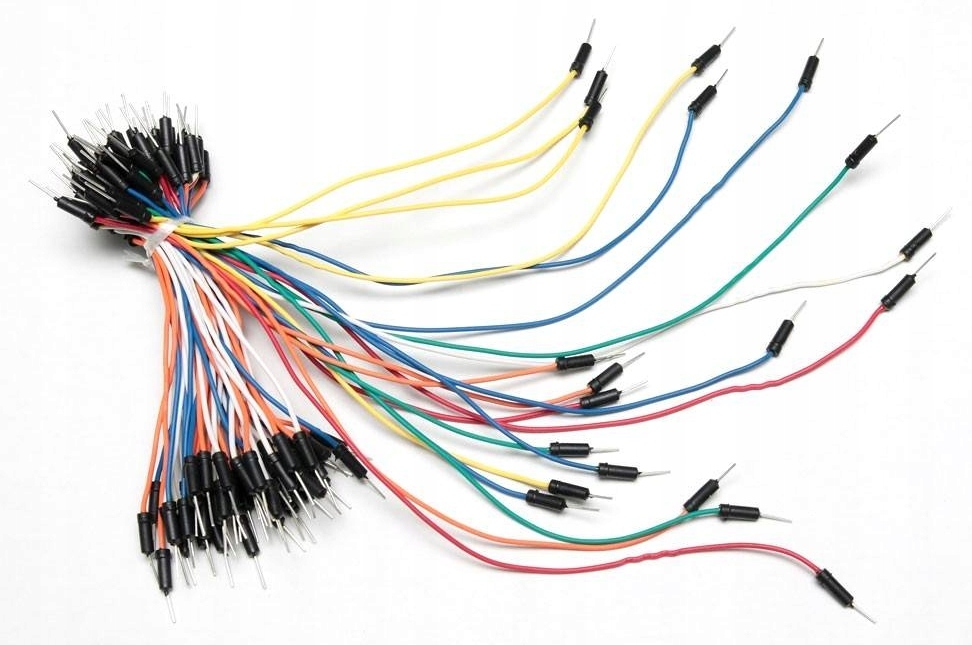 ✅Zestaw zawiera 65 różnokolorowych, elastycznych kabelków zakończonych sztywnymi szpilkami ułatwiającymi wkładanie kabelków do płytek stykowych.