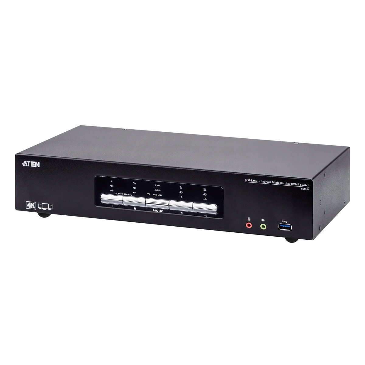 Innowacja w dziedzinie przełączania KVM do komputerów stacjonarnych - ATEN CS1964 optymalizuje pulpit, aby bez wysiłku stworzyć potrójną multimedialną stację roboczą z bezpośrednim, przyjaznym dla użytkownika dostępem do czterech komputerów za pośrednictwem jednej klawiatury USB, myszy USB i trzech monitorów HDMI o rozdzielczości do 4K DCI (4096 x 2160 przy 60 Hz).jest wyposażony w opatentowaną przez ATEN technologię Video DynaSync™ - która optymalizuje rozdzielczość ekranu i przyspiesza przełączanie systemu - oraz zintegrowany koncentrator USB 3.1 GEN zapewniający transfer danych z prędkością do 5 Gb/s, dzięki czemu można bez wysiłku przyspieszyć zadania multimedialne. Posiada również funkcję N-Key rollover, która obsługuje do 15 jednoczesnych naciśnięć klawiszy bez efektu ghostingu lub glitchingu.