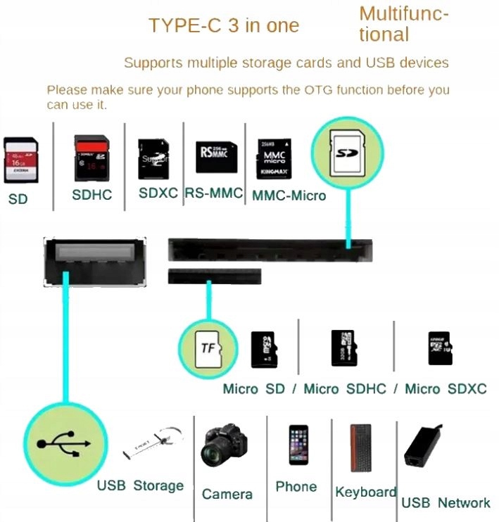 ✔️Adapter 3w1 micro USB OTG typu C umożliwia szybką synchronizację zdjęć i innych danych między kartą pamięci a smartfonem lub tabletem.Twoje urządzenie musi obsługiwać funkcję OTG, aby rozpoznawać podłączone urządzenia USB.